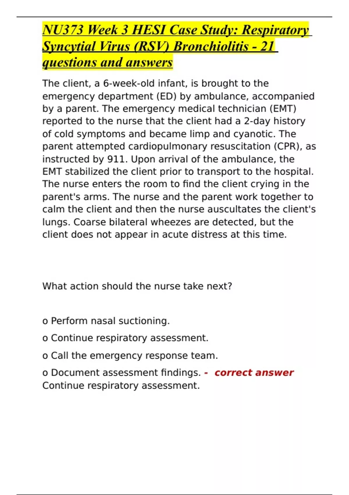 NU373 Week 3 HESI Case Study: Respiratory Syncytial Virus (RSV) Bronchiolitis - 21 questions and answers