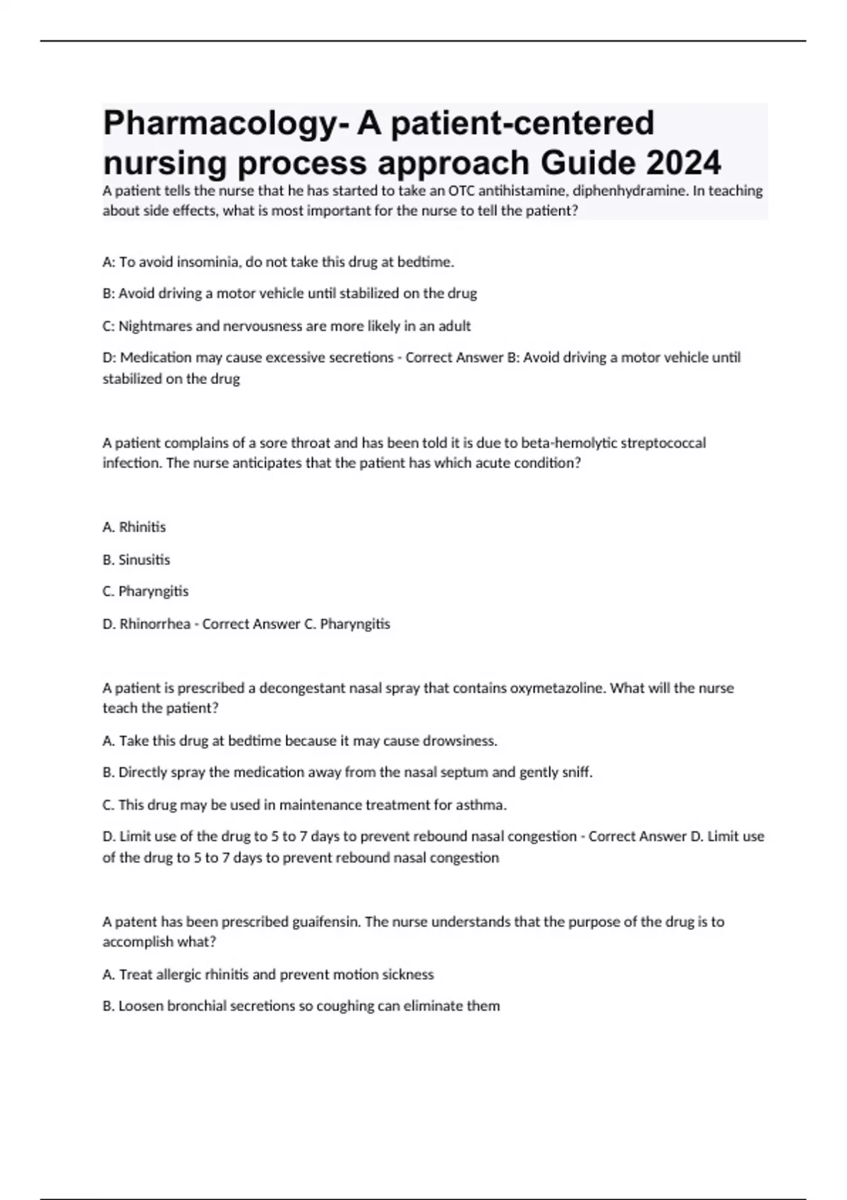 A patient tells the nurse that he has started to take an OTC antihistamine, diphenhydramine. In teaching about side effects, what is most important for the nurse to tell the patient? A: To avoid insominia, do not take this drug at bedtime. B: Avoid driving a motor vehicle until stabilized on the drug C: Nightmares and nervousness are more likely in an adult D: Medication may cause excessive secretions - Correct Answer B: Avoid driving a motor vehicle until stabilized on the drug A patient complains of a sore throat and has been told it is due to beta-hemolytic streptococcal infection. The nurse anticipates that the patient has which acute condition? A. Rhinitis B. Sinusitis C. Pharyngitis D. Rhinorrhea - Correct Answer C. Pharyngitis A patient is prescribed a decongestant nasal spray that contains oxymetazoline. What will the nurse teach the patient? A. Take this drug at bedtime because it may cause drowsiness. B. Directly spray the medication away from the nasal septum and gently sniff. C. This drug may be used in maintenance treatment for asthma. D. Limit use of the drug to 5 to 7 days to prevent rebound nasal congestion - Correct Answer D. Limit use of the drug to 5 to 7 days to prevent rebound nasal congestion A patent has been prescribed guaifensin. The nurse understands that the purpose of the drug is to accomplish what? A. Treat allergic rhinitis and prevent motion sickness B. Loosen bronchial secretions so coughing can eliminate them