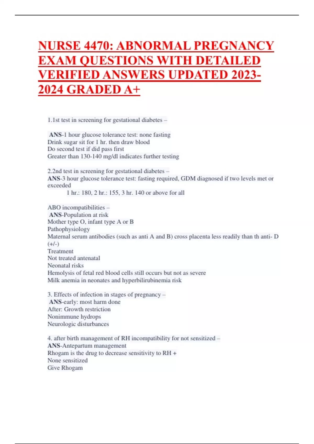 NURSE 4470: ABNORMAL PREGNANCY EXAM QUESTIONS WITH DETAILED VERIFIED ANSWERS UPDATED 2023- 2024 GRADED A+ 1.1st test in screening for gestational diabetes – ANS-1 hour glucose tolerance test: none fasting Drink sugar sit for 1 hr. then draw blood Do second test if did pass first Greater than 130-140 mg/dl indicates further testing 2.2nd test in screening for gestational diabetes – ANS-3 hour glucose tolerance test: fasting required, GDM diagnosed if two levels met or exceeded 1 hr.: 180, 2 hr.: 155, 3 hr. 140 or above for all ABO incompatibilities – ANS-Population at risk Mother type O, infant type A or B Pathophysiology Maternal serum antibodies (such as anti A and B) cross placenta less readily than th anti- D (+/-) Treatment Not treated antenatal Neonatal risks Hemolysis of fetal red blood cells still occurs but not as severe Milk anemia in neonates and hyperbilirubinemia risk 3. Effects of infection in stages of pregnancy – ANS-early: most harm done After: Growth restriction Nonimmune hydrops Neurologic disturbances 4. after birth management of RH incompatibility for not sensitized – ANS-Antepartum managemen