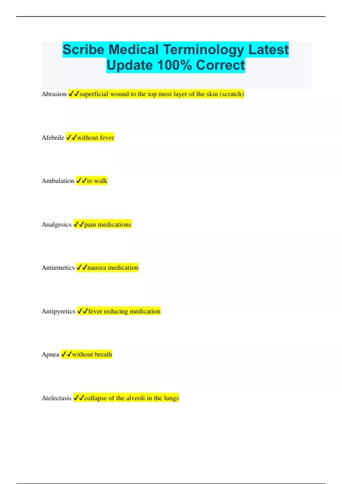 Scribe Medical Terminology Latest Update 100% Correct Abrasion superficial wound to the top most layer of the skin (scratch) Afebrile without fever Ambulation to walk Analgesics pain medications Antiemetics nausea medication Antipyretics fever reducing medication Apnea without breath Atelectasis collapse of the alveoli in the lungs Avulsion forcible tearing away of skin from the body Bradycardia slow heart rate (under 60 bpm) Cerumen earwax Cholecystectomy surgical removal of the gall bladder Claudicaiton limping Colectomy surgical removal of the large intestine/colon Contusion blunt force trauma to tissue under the skin (deep bruise) Cyanosis blue skin due to lack of oxygen Debridement removal of foreign matter or dead tissue form the wound Dyspnea difficulty breathing Dyspnea on exertion difficulty breathing upon movement/ambulation Dysuria difficulty/painful urination Ecchymosis large area of ruptured blood vessels (superficial bruise) Emesis vomitting Epistaxis nose bleed Erythema redness Febrile fever Gait manner of walking Gravid pregnant (gravida=number of pregnancies, para=number of live births) Hematemesis blood in vomit Hematochezia blood in stools Hematoma dammage to the blood vessels that causes a lump under the skin Hematuria blood in urine Hemoptysis