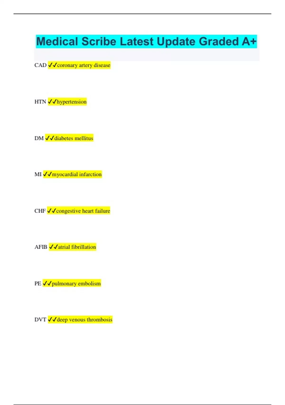 Medical Scribe Latest Update Graded A+ CAD coronary artery disease HTN hypertension DM diabetes mellitus MI myocardial infarction CHF congestive heart failure AFIB atrial fibrillation PE pulmonary embolism DVT deep venous thrombosis BKA below knee amputation PTX pneumothorax COPD chronic obstructive pulmonary disease PNA pneumonia GERD gastroesophageal reflux disease CVA (stroke) cerebrovascular accident TIA transient ischemic attack URI upper respiratory infection UTI urinary tract infection AAA abdominal aortic aeurysm SBO small bowel obstruction DNR do not resuscitate CP chest pain SOB shortness of breath N/V/D nausea/vomitting/diarrhea HA headache DOE dyspnea on exertion BM bowel movement AMS altered mental status LOC loss/level of consciousness MVA motor vehicle accident OD overdose CC chief complaint c/o complains of h/o history of a with line over it before c with line over it with s with line over it without s/p status post delta change EMS emergency medical services PTA prior to arrival EOMI extra ocular movements intact PERRL pupils equal round and reactive to light CVA costovertebral angle tenderness DPP dorsalis pedis pulse A & O alert and oriented NTG nitroglycerin ASA aspirin NSAID non steroidal anti-inflammatory drug O2 2L NC oxygen 2 liters nasal cannula PCN penicillin NSR normal sinus rhythm RBBB right bundle branch block PVC premature ventricular contractions ST increase ST elevation LAD left axis deviation H&H hemoglobin and hematocrit Trop troponin CXR chest x-ray US ultrasound CT A/P cat scan abdomen pelvis Appendix removal appendectomy Gall bladder removal cholecystectomy Breast removal mastectomy Tubes tied bilateral tubal ligation uterus removal hysterectomy open heart surgery coronary artery bypass graft carotid artery cleaning carotid endarterectomy kidney removal nephrectomy partial colon resection partial colectomy stomach stapled gastric bypass slow heart rate bradycardia bruising ecchymosis fast breathing rate tachypnea pain with urinating dysuria pass-out syncope swelling edema throat redness pharyngeal erythema black tarry stools melena runny nose rhinorrhea muscle aches myalgias acute blockage of an artery that provides blood to the brain CVA translocation of a thrombus leading to dyspnea and hypoxia PE inflammation of a small vermiform appendage prone to rupture; this disease is the leading concern for any lower abdominal pain appendicitis electrical irregularity of the heart with concern about developing RVR AFIB ischemia and infarct of the anterolateral myocardium STEMI Pneumothorax (disease work-up) CXR Right femur fracture (disease work-up) right hip/ thigh xray PE (disease work-up) CTA or VQ scan Cholelithiasis (gallstones) (disease work-up) RUQ US CHF (disease work-up) CXR or Elevated BNP Hemorrhagic CVA (disease work-up) CT head or lumbar puncture Appendicitis (disease work-up) CT A/P with PO contrast Meningitis (disease work-up) Lumbar puncture AFIB (disease work-up) EKG Pancreatitis (disease work-up) Elevated lipase Who is the intended audience of an HPI? Give an example of someone other than your physician who may read it after the patient has been dispositioned. Hospitalist, specialist, medical coders, lawyers, PCP.... What is the central difference between the HPI and ROS? HPI is the story of the chief complaint ROS is a head to toe review ( a checklist of positive and negatives) What are 4 types of focal neurological deficits? 1.) Changes in speech 2.) Changes in vision 3.) One sided motor weakness 4.) One sided numbness or tingling A female patient has been pregnant four times in the past, is currently pregnant, and has two children at home. Calculate the G, P, and Ab G: 5 P: 2 A: 2 Please list three very important cardiac risk factors? CAD Family HX or CAD < 55 Y/O HTN DM Smoking Hyperlipidemia If a patient came to the ED complaining of a productive cough and notes that they also have a fever, would you document the "fever" in the HPI or the ROS? Why? HPI pertinent to CC You are evaluating a patient complaining of exacerbated back pain for two days. He notes that he has also had a runny nose for a week. Would you document the "runny nose" in the HPI or ROS? Why? ROS, not pertinent to CC What are four things that you should document in the HPI for any patient presenting to the ED after a syncopal episode? 1.) Symptoms before event 2.) Symptoms during event 3.) Symptoms after event 4.) How they feel currently The physician checks the patient's pulses at the right wrist, the top of the right foot, and the left neck. The doctor states " The pulses are fine". What do you right on the chart? Right radial +2 Right DP +2 Left carotid +2 The physician states "there is no rebound, no guarding". What part of the body are they examining? Abdomen Can you document both "clear breath sounds bilaterally" and "rhonchi in the right base"? Why or why not? No, they contradict each other Your physician interprets a patient's EKG prior to performing the physical exam: they tell you "The EKG shows AFIB at a rate of 90 beats per minute." Later in the patient's room, during auscultation of the heart, what type of rhythm will the doctor certainly hear and verbalize to you? Irregularly irregular rhythm What part of the physical exam would contain both "pronator drift" and "CN II-XII intact"? Neurological How many body system would you need to document for a "Level 5" ROS 10 List 5 of the coding "elements" of an HPI 1.) Location 2.) Severity 3.) Quality 4.) Timing 5.) Onset 6.) Associated symptoms 7.) Modifying factors 8.) Context True/False Is it acceptable to look up your own medical information while working in the ED FALSE True/False While working in the ED you can look up your little brother's medical information because he was recently seen in the ED last week. FALSE True/False Brittany Spears is checked in as a patient in the ER. Is it OK to open her chart as long as you don't tell anybody about what you read? FALSE What is Protected Health Information (PHI)? 