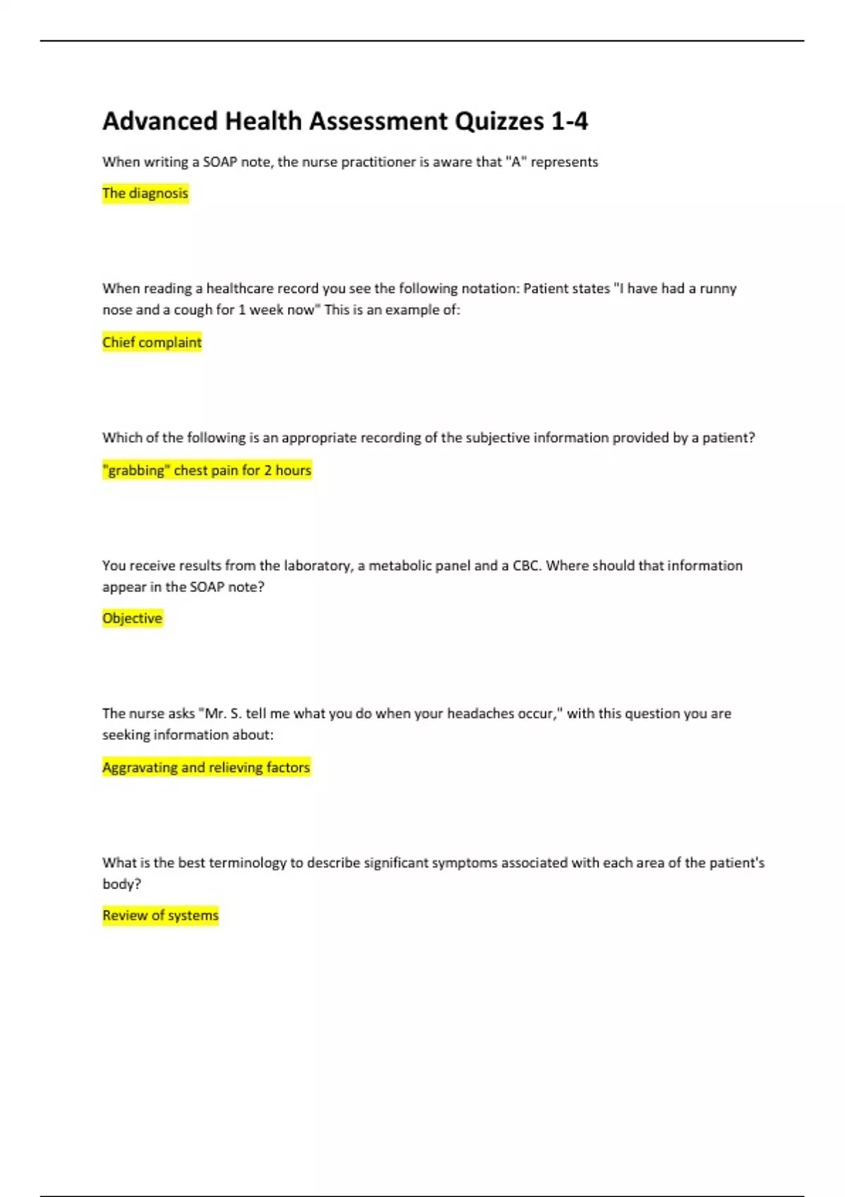 advanced health assessment quizzes 1 4 fully solve