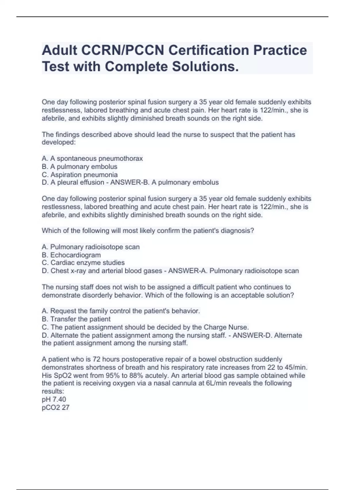Adult CCRN/PCCN Certification Practice Test with Complete Solutions.