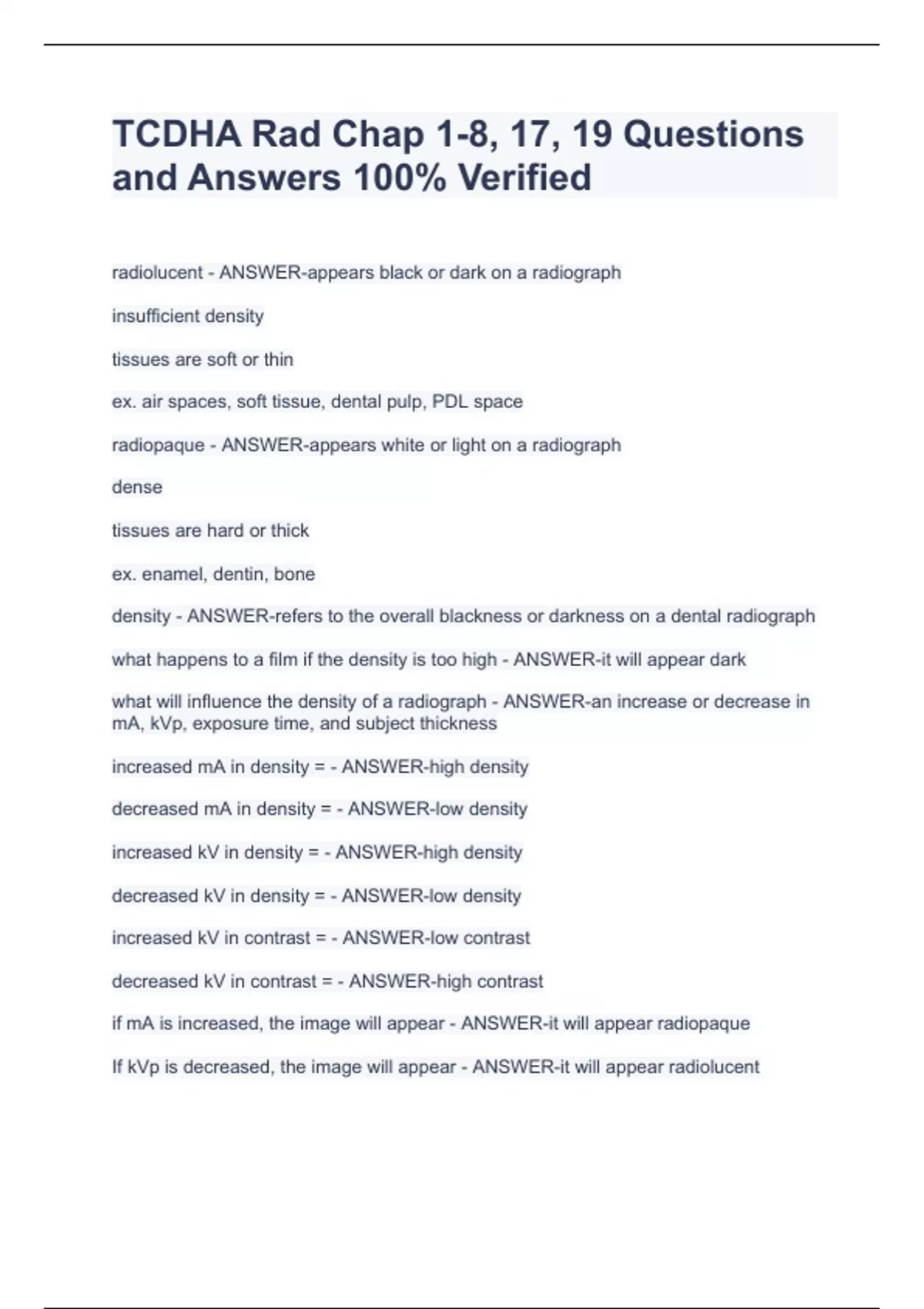 TCDHA Rad Chap 1-8, 17, 19 Questions and Answers 100% Verified TCDHA Rad Chap 1-8, 17, 19 Questions and Answers 100% Verified TCDHA Rad Chap 1-8, 17, 19 Questions and Answers 100% Verified TCDHA Rad Chap 1-8, 17, 19 Questions and Answers 100% Verified TCDHA Rad Chap 1-8, 17, 19 Questions and Answers 100% Verified radiolucent - ANSWER-appears black or dark on a radiograph insufficient density tissues are soft or thin ex. air spaces, soft tissue, dental pulp, PDL space radiopaque - ANSWER-appears white or light on a radiograph