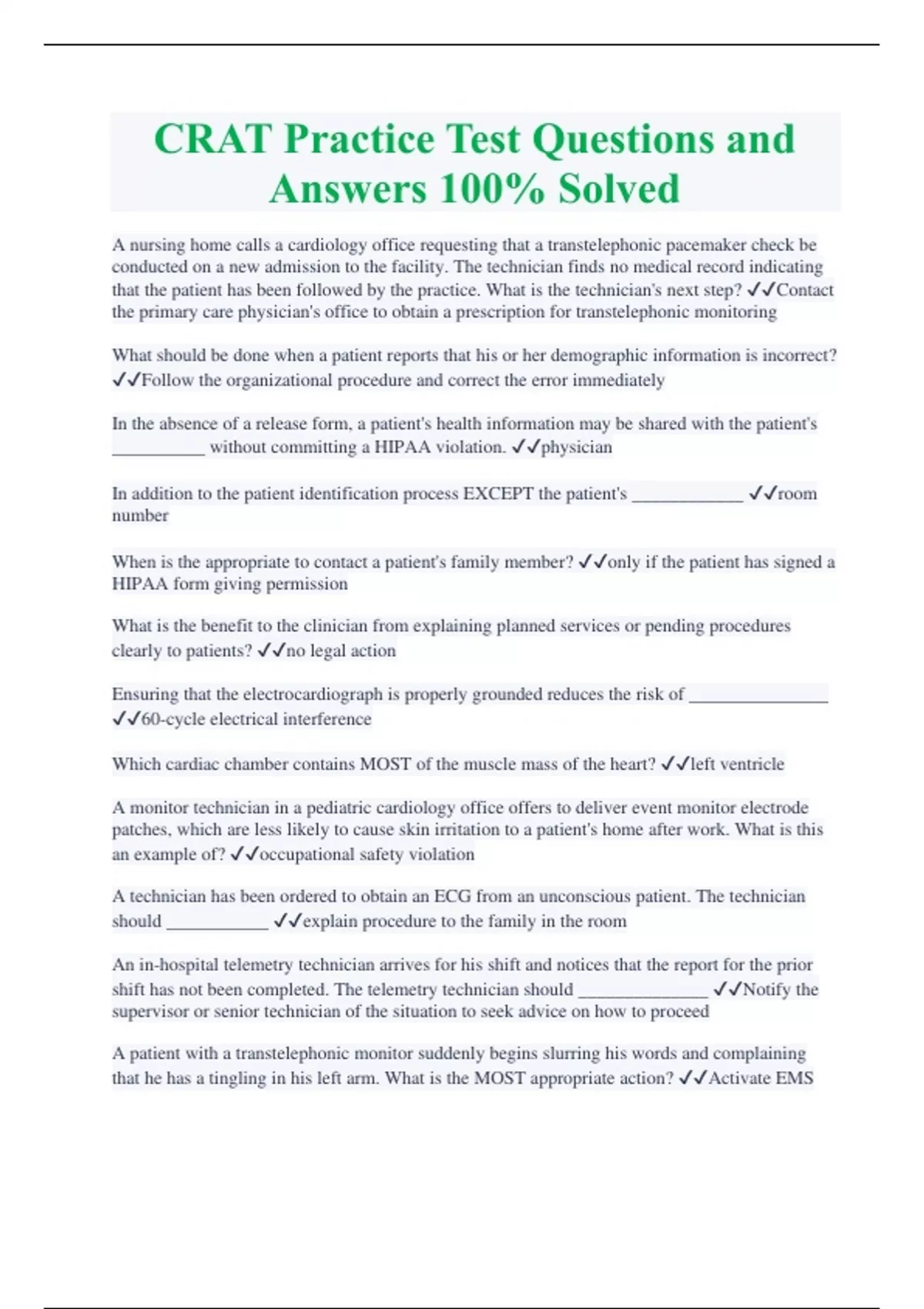 CRAT Practice Test Questions and Answers 100% Solved A nursing home calls a cardiology office requesting that a transtelephonic pacemaker check be conducted on a new admission to the facility. The technician finds no medical record indicating that the patient has been followed by the practice. What is the technician's next step? Contact the primary care physician's office to obtain a prescription for transtelephonic monitoring What should be done when a patient reports that his or her demographic information is incorrect? Follow the organizational procedure and correct the error immediately In the absence of a release form, a patient's health information may be shared with the patient's __________ without committing a HIPAA violation. physician In addition to the patient identification process EXCEPT the patient's ____________ room number When is the appropriate to contact a patient's family member? only if the patient has signed a HIPAA form giving permission What is the benefit to the clinician from explaining planned services or pending procedures clearly to patients? no legal action Ensuring that the electrocardiograph is properly grounded reduces the risk of _______________ 60-cycle electrical interference Which cardiac chamber contains MOST of the muscle mass of the heart? left ventricle A monitor technician in a pediatric cardiology office offers to deliver event monitor electrode patches, which are less likely to cause skin irritation to a patient's home after work. What is this an example of? occupational safety violation A technician has been ordered to obtain an ECG from an unconscious patient. The technician should ___________ explain procedure to the family in the room An in-hospital telemetry technician arrives for his shift and notices that the report for the prior shift has not been completed. The telemetry technician should ______________ Notify the supervisor or senior technician of the situation to seek advice on how to proceed A patient with a transtelephonic monitor suddenly begins slurring his words and complaining that he has a tingling in his left arm. What is the MOST appropriate action? Activate EMS