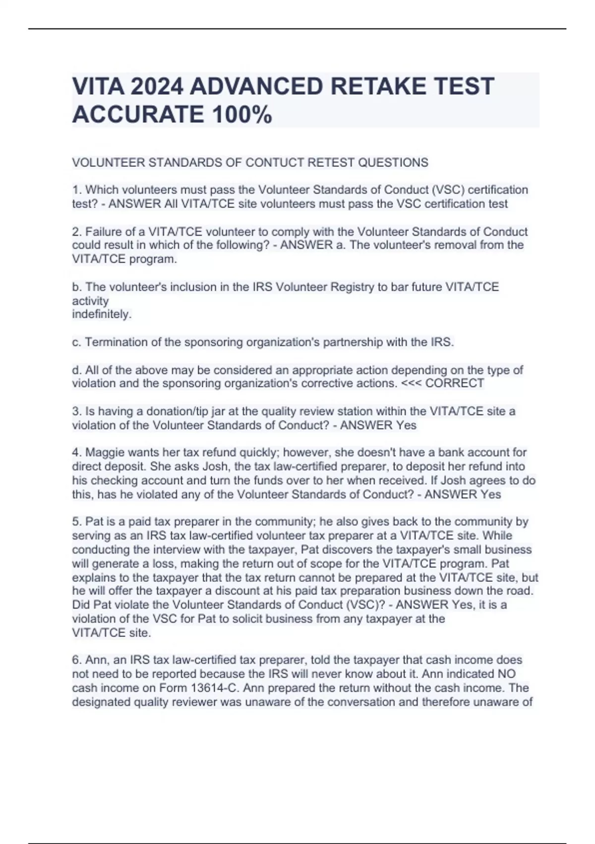 VOLUNTEER STANDARDS OF CONTUCT RETEST QUESTIONS 1. Which volunteers must pass the Volunteer Standards of Conduct (VSC) certification test? - ANSWER All VITA/TCE site volunteers must pass the VSC certification test 2. Failure of a VITA/TCE volunteer to comply with the Volunteer Standards of Conduct could result in which of the following? - ANSWER a. The volunteer's removal from the VITA/TCE program. b. The volunteer's inclusion in the IRS Volunteer Registry to bar future VITA/TCE activity indefinitely. c. Termination of the sponsoring organization's partnership with the IRS. d. All of the above may be considered an appropriate action depending on the type of violation and the sponsoring organization's corrective actions. <<< CORRECT 3. Is having a donation/tip jar at the quality review station within the VITA/TCE site a violation of the Volunteer Standards of Conduct? - ANSWER Yes 4. Maggie wants her tax refund quickly; however, she doesn't have a bank account for direct deposit. She asks Josh, the tax law-certified preparer, to deposit her refund into his checking account and turn the funds over to her when received. If Josh agrees to do this, has he violated any of the Volunteer Standards of Conduct? - ANSWER Yes 5. Pat is a paid tax preparer in the community; he also gives back to the community by serving as an IRS tax law-certified volunteer tax preparer at a VITA/TCE site. While conducting the interview with the taxpayer, Pat discovers the taxpayer's small business will generate a loss, making the return out of scope for the VITA/TCE program. Pat explains to the taxpayer that the tax return cannot be prepared at the VITA/TCE site, but he will offer the taxpayer a discount at his paid tax preparation business down the road. Did Pat violate the Volunteer Standards of Conduct (VSC)? - ANSWER Yes, it is a violation of the VSC for Pat to solicit business from any taxpayer at the VITA/TCE site. 6. Ann, an IRS tax law-certified tax preparer, told the taxpayer that c