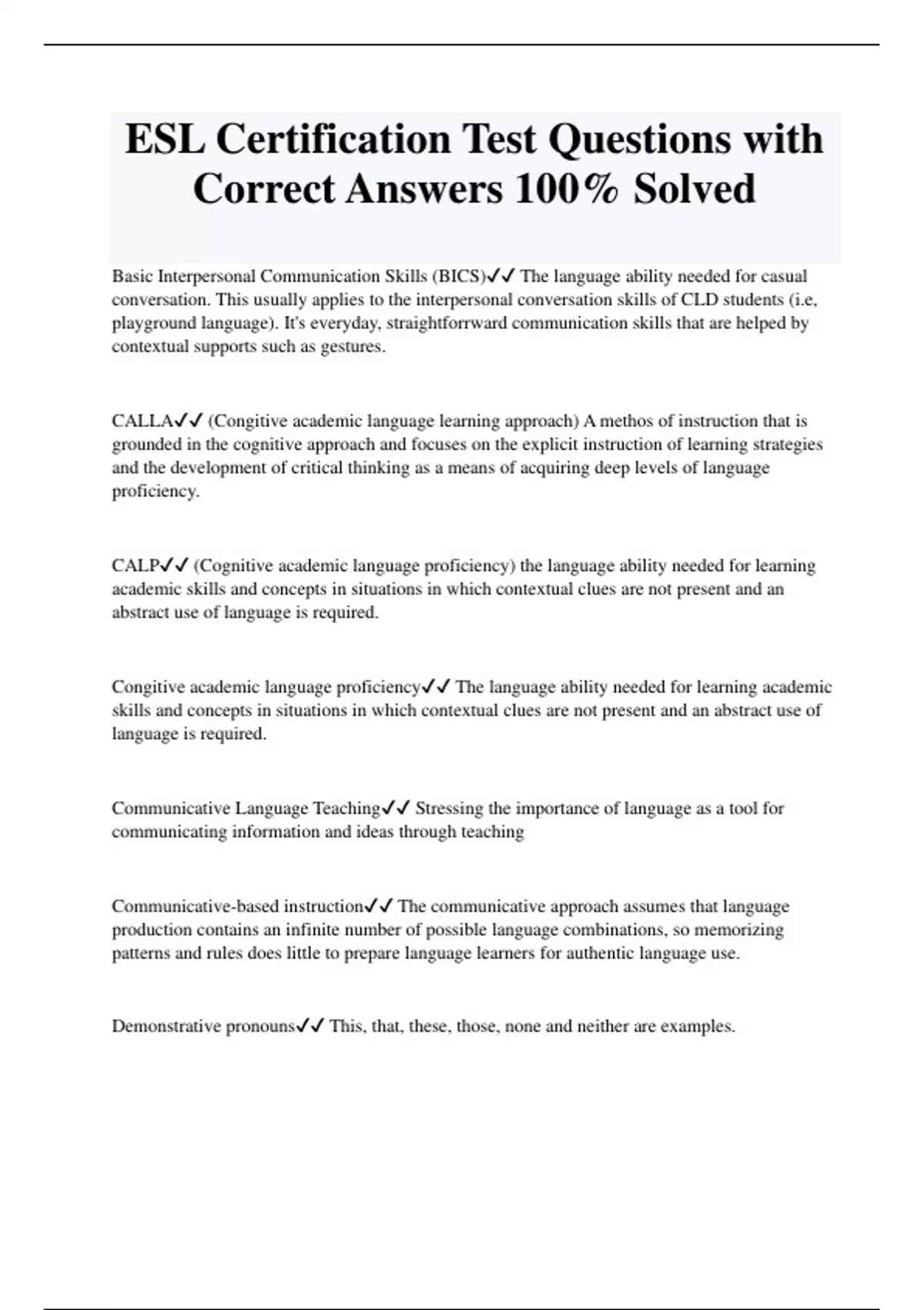 ESL Certification Test Questions with Correct Answers 100% Solved Basic Interpersonal Communication Skills (BICS) The language ability needed for casual conversation. This usually applies to the interpersonal conversation skills of CLD students (i.e, playground language). It's everyday, straightforrward communication skills that are helped by contextual supports such as gestures. CALLA (Congitive academic language learning approach) A methos of instruction that is grounded in the cognitive approach and focuses on the explicit instruction of learning strategies and the development of critical thinking as a means of acquiring deep levels of language proficiency. CALP (Cognitive academic language proficiency) the language ability needed for learning academic skills and concepts in situations in which contextual clues are not present and an abstract use of language is required. Congitive academic language proficiency The language ability needed for learning academic skills and concepts in situations in which contextual clues are not present and an abstract use of language is required.