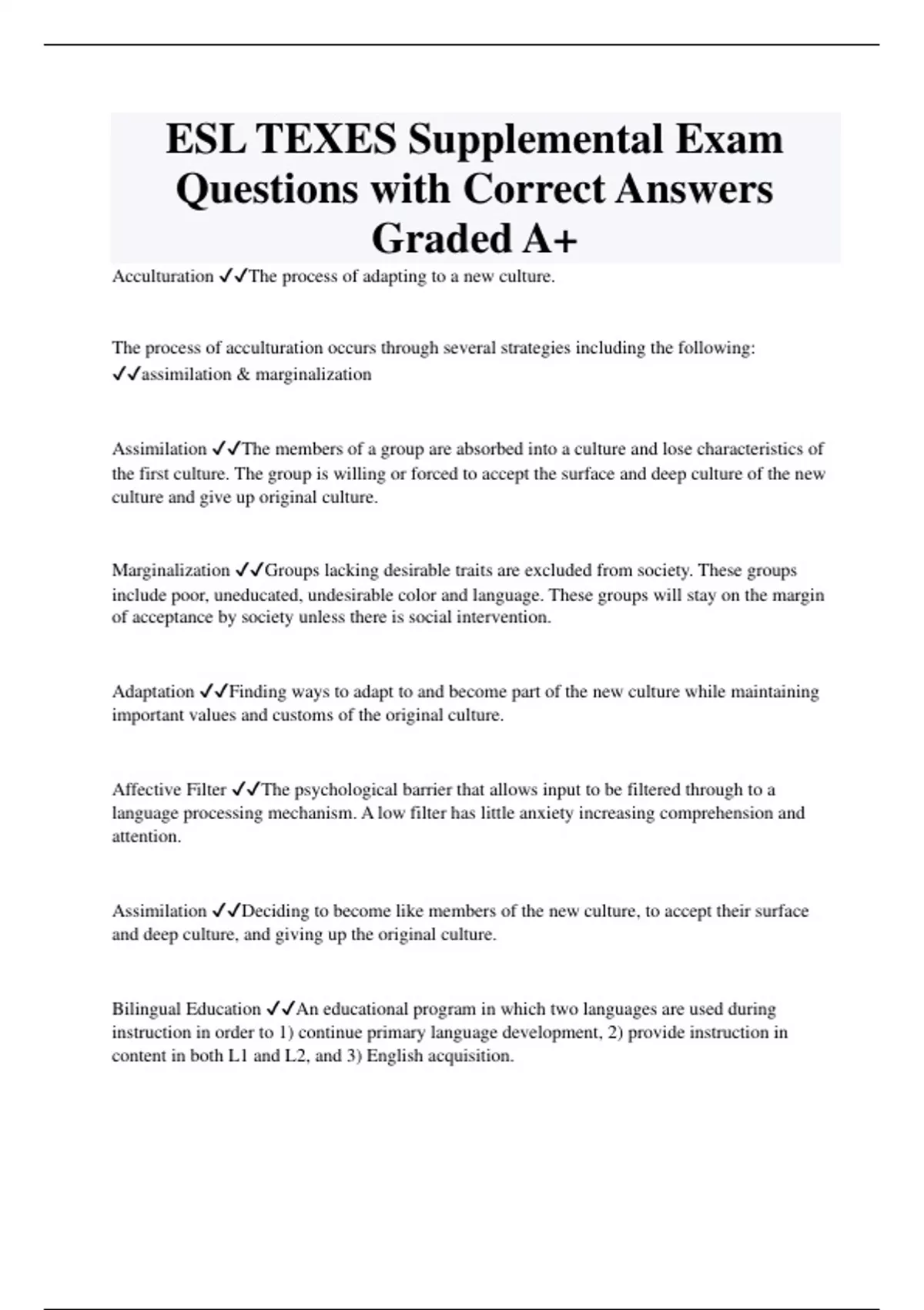 ESL TEXES Supplemental Exam Questions with Correct Answers Graded A+ Acculturation The process of adapting to a new culture. The process of acculturation occurs through several strategies including the following: assimilation & marginalization Assimilation The members of a group are absorbed into a culture and lose characteristics of the first culture. The group is willing or forced to accept the surface and deep culture of the new culture and give up original culture. Marginalization Groups lacking desirable traits are excluded from society. These groups include poor, uneducated, undesirable color and language. These groups will stay on the margin of acceptance by society unless there is social intervention. Adaptation Finding ways to adapt to and become part of the new culture while maintaining important values and customs of the original culture. Affective Filter The psychological barrier that allows input to be filtered through to a language processing mechanism. A low filter has little anxiety increasing comprehension and attention. Assimilation Deciding to become like members of the new culture, to accept their surface and deep culture, and giving up the original culture. Bilingual Education An educational program in which two languages are used during instruction in order to 1) continue primary language development, 2) provide instruction in content in both L1 and L2, and 3) English acquisition.