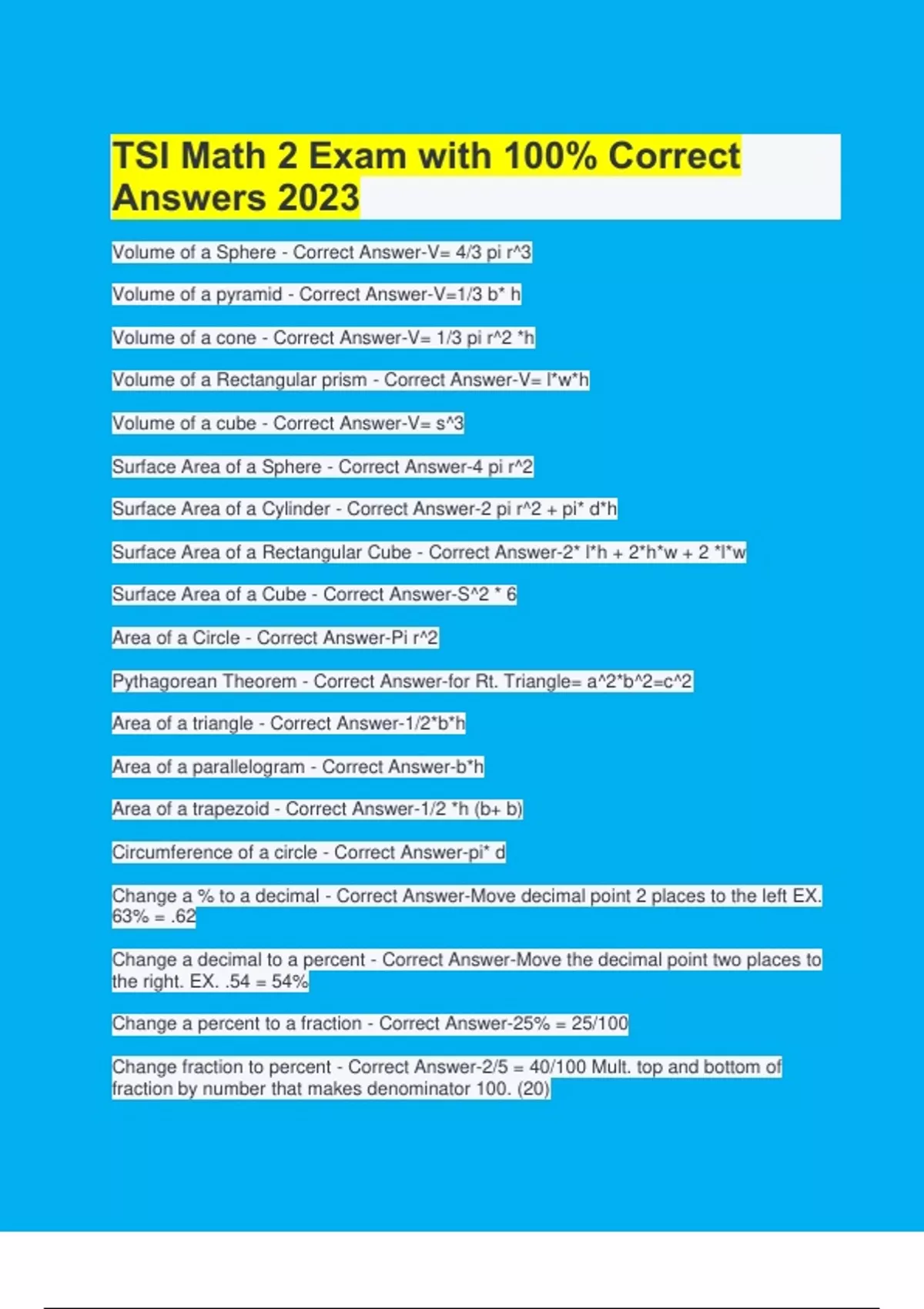 Volume of a Sphere - Correct Answer-V= 4/3 pi r^3 Volume of a pyramid - Correct Answer-V=1/3 b* h Volume of a cone - Correct Answer-V= 1/3 pi r^2 *h Volume of a Rectangular prism - Correct Answer-V= l*w*h Volume of a cube - Correct Answer-V= s^3 Surface Area of a Sphere - Correct Answer-4 pi r^2 Surface Area of a Cylinder - Correct Answer-2 pi r^2 + pi* d*h Surface Area of a Rectangular Cube - Correct Answer-2* l*h + 2*h*w + 2 *l*w Surface Area of a Cube - Correct Answer-S^2 * 6 Area of a Circle - Correct Answer-Pi r^2 Pythagorean Theorem - Correct Answer-for Rt. Triangle= a^2*b^2=c^2 Area of a triangle - Correct Answer-1/2*b*h Area of a parallelog