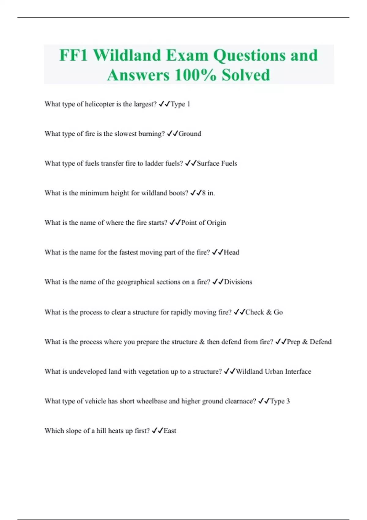 FF1 Wildland Exam Questions and Answers 100% Solved What type of helicopter is the largest? Type 1 What type of fire is the slowest burning? Ground What type of fuels transfer fire to ladder fuels? Surface Fuels What is the minimum height for wildland boots? 8 in. What is the name of where the fire starts? Point of Origin What is the name for the fastest moving part of the fire? Head What is the name of the geographical sections on a fire? Divisions What is the process to clear a structure for rapidly moving fire? Check & Go What is the process where you prepare the structure & then defend from fire? Prep & Defend What is undeveloped land with vegetation up to a structure? Wildland Urban Interface What type of vehicle has short wheelbase and higher ground clearnace? Type 3 Which slope of a hill heats up first? East