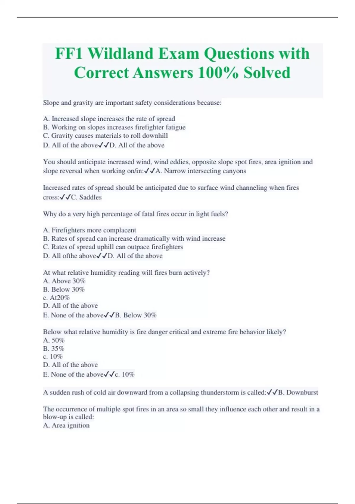 FF1 Wildland Exam Questions with Correct Answers 100% Solved Slope and gravity are important safety considerations because: A. Increased slope increases the rate of spread B. Working on slopes increases firefighter fatigue C. Gravity causes materials to roll downhill D. All of the aboveD. All of the above You should anticipate increased wind, wind eddies, opposite slope spot fires, area ignition and slope reversal when working on/in:A. Narrow intersecting canyons Increased rates of spread should be anticipated due to surface wind channeling when fires cross:C. Saddles Why do a very high percentage of fatal fires occur in light fuels? A. Firefighters more complacent B. Rates of spread can increase dramatically with wind increase C. Rates of spread uphill can outpace firefighters D. All ofthe aboveD. All of the above At what relative humidity reading will fires burn actively? A. Above 30% B. Below 30% c. At20% D. All of the above E. None of the aboveB. Below 30% Below what relative humidity is fire danger critical and extreme fire behavior likely? A. 50% B. 35% c. 10% D. All of the above E. None of the abovec. 10% A sudden rush of cold air downward from a collapsing thunderstorm is called:B. Downburst The occurrence of multiple spot fires in an area so small they influence each other and result in a blow-up is called: A. Area ignition