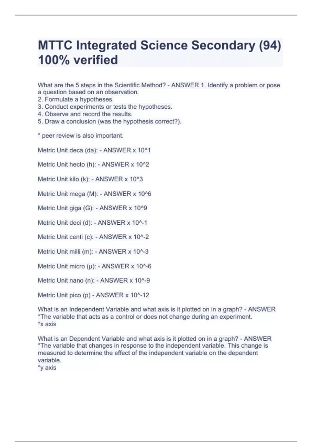 MTTC Integrated Science Secondary (94) 100% verified What are the 5 steps in the Scientific Method? - ANSWER 1. Identify a problem or pose a question based on an observation. 2. Formulate a hypotheses. 3. Conduct experiments or tests the hypotheses. 4. Observe and record the results. 5. Draw a conclusion (was the hypothesis correct?). * peer review is also important. Metric Unit deca (da): - ANSWER x 10^1 Metric Unit hecto (h): - ANSWER x 10^2 Metric Unit kilo (k): - ANSWER x 10^3 Metric Unit mega (M): - ANSWER x 10^6 Metric Unit giga (G): - ANSWER x 10^9 Metric Unit deci (d): - ANSWER x 10^-1 Metric Unit centi (c): - ANSWER x 10^-2 Metric Unit milli (m): - ANSWER x 10^-3 Metric Unit micro (µ): - ANSWER x 10^-6 Metric Unit nano (n): - ANSWER x 10^-9 Metric Unit pico (p) - ANSWER x 10^-12 What is an Independent Variable and what axis is it plotted on in a graph? - ANSWER *The variable that acts as a control or does not change during an experiment. *x axis What is an Dependent Variable and what axis is it plotted on in a graph? - ANSWER *The variable that changes in response to the independent variable. This change is measured to determine the effect of the independent variable on the dependent variable. *y axis What are random experimental errors? - ANSWER Errors that are not consistent across the data set. * can result in collected data that does not seem to fit and may be wildly different from the rest of the data, or they may result in data that is indistinguishable from the rest. * may be the result of outside factors that are not considered variables *referred to as noise What are systematic experimental errors? - ANSWER An error that will show up consistently across a sample or data set. *may be the result of a flaw in the experiment design or instrumentation *affects the average *known as a bias Chemistry lab fire hazards - ANSWER Volatile solvents: ether, acetone, benzene *store in open beaker or Erlenmeyer flask *use extreme caution around sparks * heat in fume hood with a steam bath (not on a hot plate) Chemistry lab chemical burns - ANSWER Mineral acids and alkalis are corrosive to the skin and eyes *acid halides and phenols are corrosive and often toxic Chemistry lab toxic chemicals that can be absorbed through the skin - ANSWER dimethyl sulfoxide (DMSO) nitrobenzene Chemistry lab toxic fume inhalation - ANSWER acetyl chloride- severely irritate membranes in the eyes, nose, throat, and lungs benzyl chloride- eye irritation and tears Simple microscope - ANSWER a microscope that contains only one lens Compound microscope - ANSWER Microscope that contains two or more lenses to increase total magnification (usually 3 lenses) *multiply each magnification to obtain total magnification Accuracy of balances - ANSWER Most accurate- Electronic triple- beam Least- Spring balance Chromotography - ANSWER Is the separation of a mobile phase carrying a mixture that moves in contact with a selectively absorbent stationary phase. Analyte - ANSWER The substance or chemical being analyzed or detected in a specimen reagent - ANSWER a chemical agent for use in chemical reactions centrifuge - ANSWER an apparatus that uses centrifugal force to separate particles from a suspension Heterogeneous mixture - ANSWER A mixture in which different materials can be distinguished easily precipitate - ANSWER A solid that forms and settles out of a liquid mixture supernatant - ANSWER liquid above the precipitate that remains after centrifugation that can be removed from the precipitate with a pipet- also called centrifugate Spectrophotometry - ANSWER An analytical method for identifying a substance by its selective absorption of different wavelengths of light. Electrophoresis - ANSWER A technique for separating macromolecules (proteins, RNA, DNA) on a gel using an electric field. Calorimetry - ANSWER The measurement of heat flow (into or out of a system) as the result of a chemical reaction or physical process. Titration - ANSWER a measured amount of a solution of unknown concentration is added to a known volume of a second solution until the reaction between them is just complete Charles Robert Darwin - ANSWER Author of "On the Origin of Species" and founder of modern evolution theory. Natural Selection, natural change, gradual change, and common descent *d.1882 Anton van Leeuwnhoek - ANSWER made his own lenses found unicellular organisms cell theory (all cells come from preexisting cells) *d. 1723