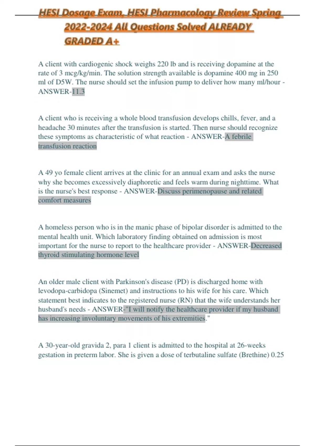 HESI Dosage Exam, HESI Pharmacology Review Spring All Questions Solved ALREADY GRADED A+