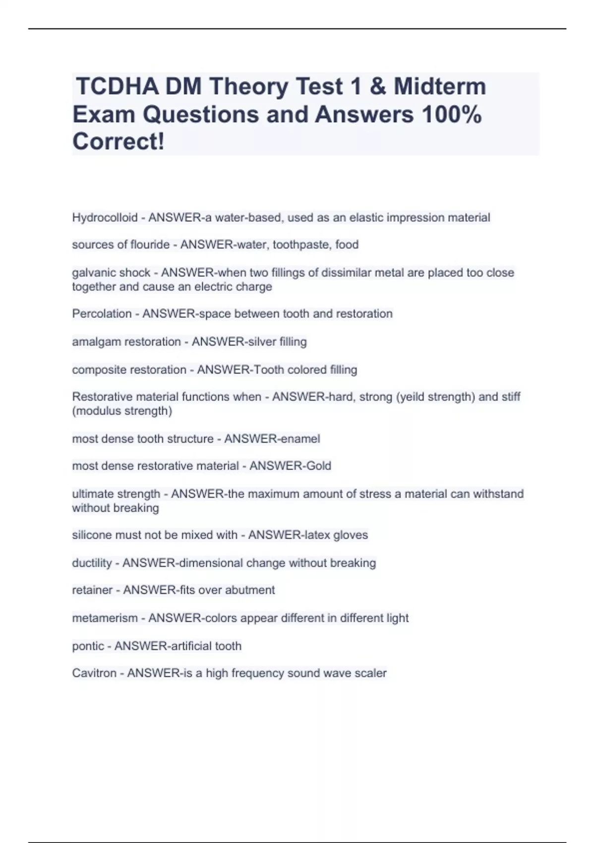 TCDHA DM Theory Test 1 & Midterm Exam Questions and Answers 100% Correct!