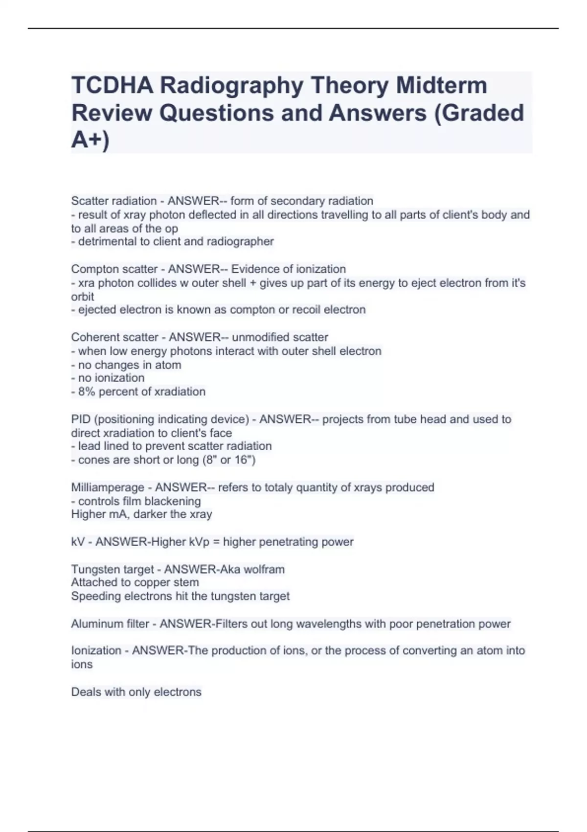 TCDHA Radiography Theory Midterm Review Questions and Answers (Graded A+)