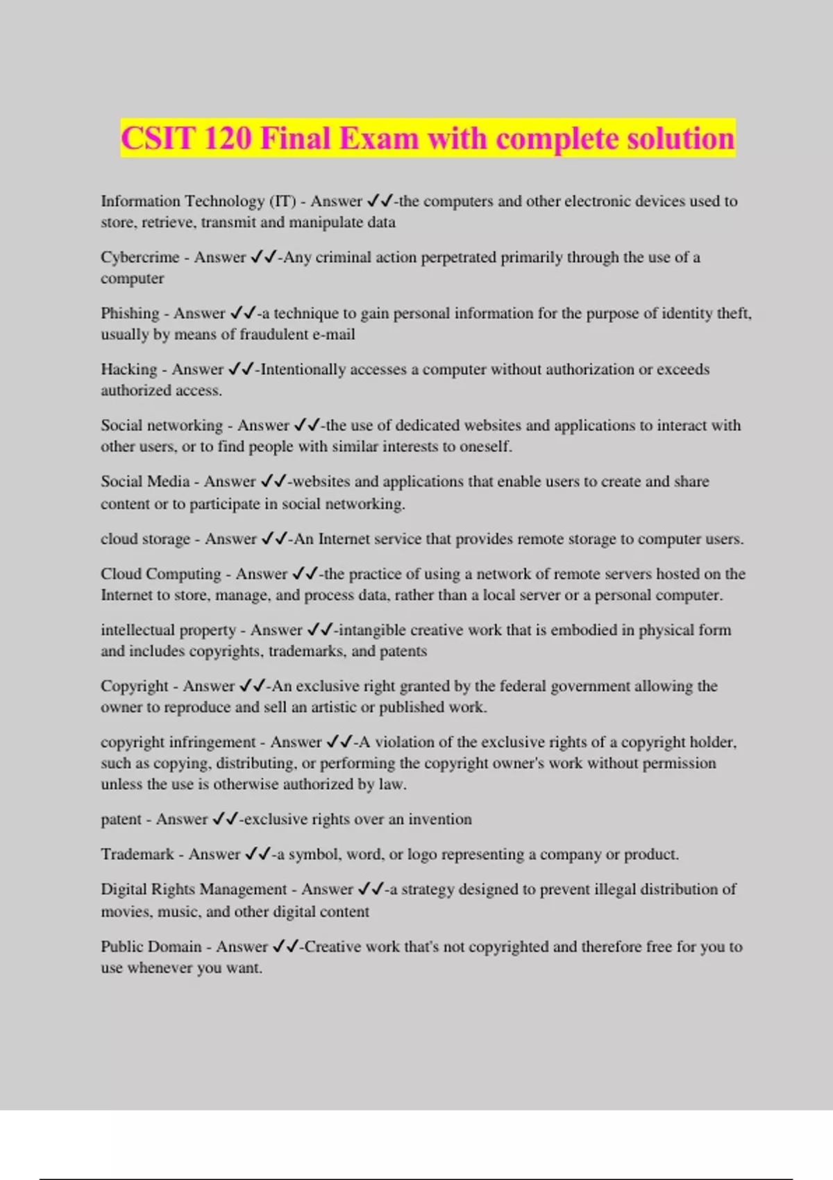 CSIT 120 Final Exam with complete solution Information Technology (IT) - Answer ️️ -the computers and other electronic devices used to store, retrieve, transmit and manipulate data Cybercrime - Answer ️️ -Any criminal action perpetrated primarily through the use of a computer Phishing - Answer ️️ -a technique to gain personal information for the purpose of identity theft, usually by means of fraudulent e-mail Hacking - Answer ️️ -Intentionally accesses a computer without authorization or exceeds authorized access. Social networking - Answer ️️ -the use of dedicated websites and applications to interact with other users, or to find people with similar interests to oneself. Social Media - Answer ️️ -websites and applications that enable users to create and share content or to participate in social networking. cloud storage - Answer ️️ -An Internet service that provides remote storage to computer users. Cloud Computing - Answer ️️ -the practice of using a network of remote servers hosted on the Internet to store, manage, and process data, rather than a local server or a personal computer. intellectual property - Answer ️️ -intangible creative work that is embodied in physical form and includes copyrights, trademarks, and patents Copyright - Answer ️️ -An exclusive right granted by the federal government allowing the owner to reproduce and sell an artistic or published work. copyright infringement - Answer ️️ -A violation of the exclusive rights of a copyright holder, such as copying, distributing, or performing the copyright owner's work without permission unless the use is otherwise authorized by law. patent - Answer ️️ -exclusive rights over an invention Trademark - Answer ️️ -a symbol, word, or logo representing a company or product. Digital Rights Management - Answer ️️ -a strategy designed to prevent illegal distribution of movies, music, and other digital content Public Domain - Answer ️️ -Creative work that's not copyrighted and therefore free for you to use whenever you want.