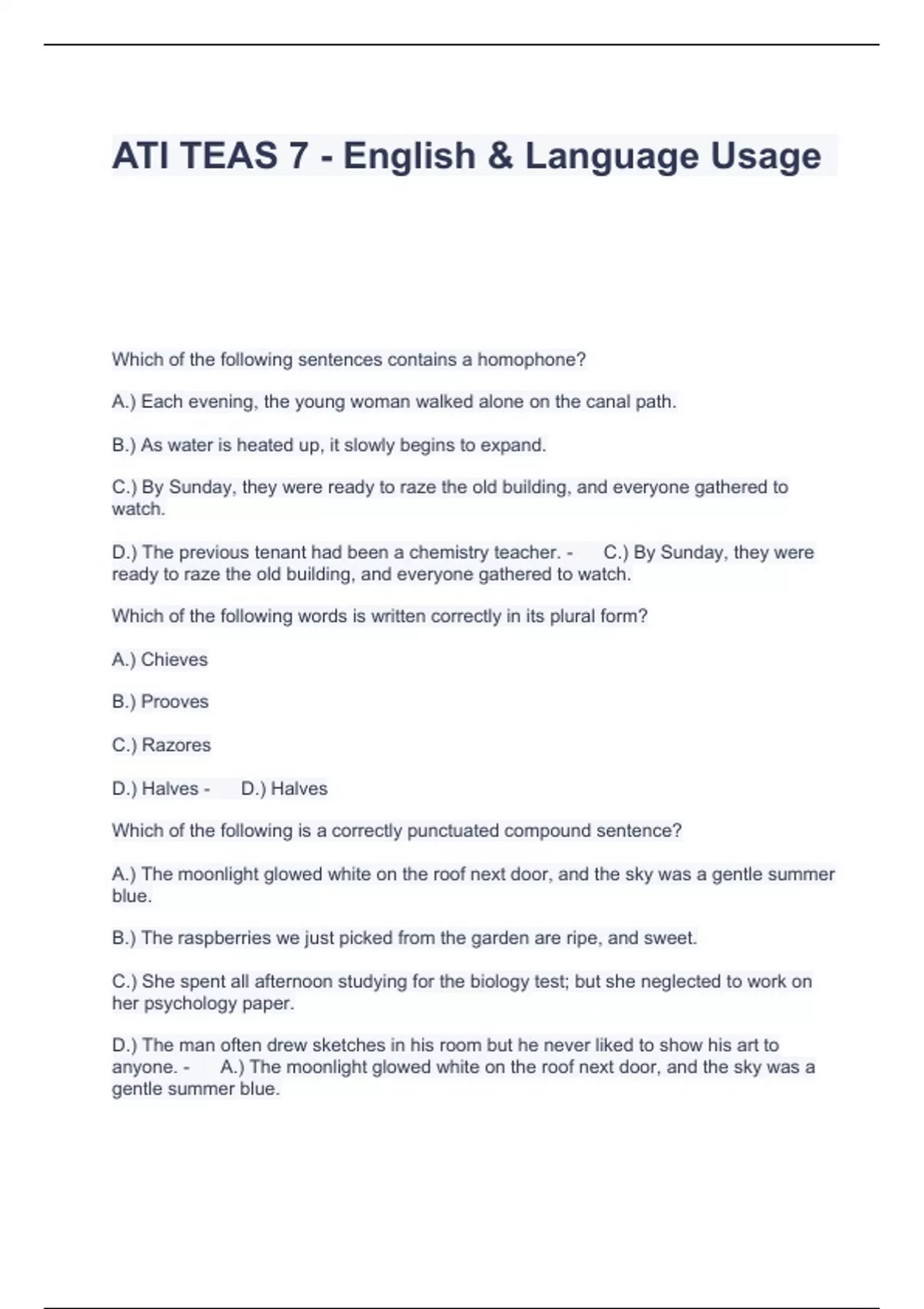 Which of the following sentences contains a homophone? A.) Each evening, the young woman walked alone on the canal path. B.) As water is heated up, it slowly begins to expand. C.) By Sunday, they were ready to raze the old building, and everyone gathered to watch. D.) The previous tenant had been a chemistry teacher. - C.) By Sunday, they were ready to raze the old building, and everyone gathered to watch. Which of the following words is written correctly in its plural form? A.) Chieves B.) Prooves C.) Razores D.) Halves - D.) Halves Which of the following is a correctly punctuated compound sentence? A.) The moonlight glowed white on the roof next door, and the sky was a gentle summer blue. B.) The raspberries we just picked from the garden are ripe, and sweet. C.) She spent all afternoon studying for the biology test; but she neglected to work on her psychology paper. D.) The man often drew sketches in his room but he never liked to show his art to anyone. - A.) The moonlight glowed white on the roof next door, and the sky was a gentle summer blue.