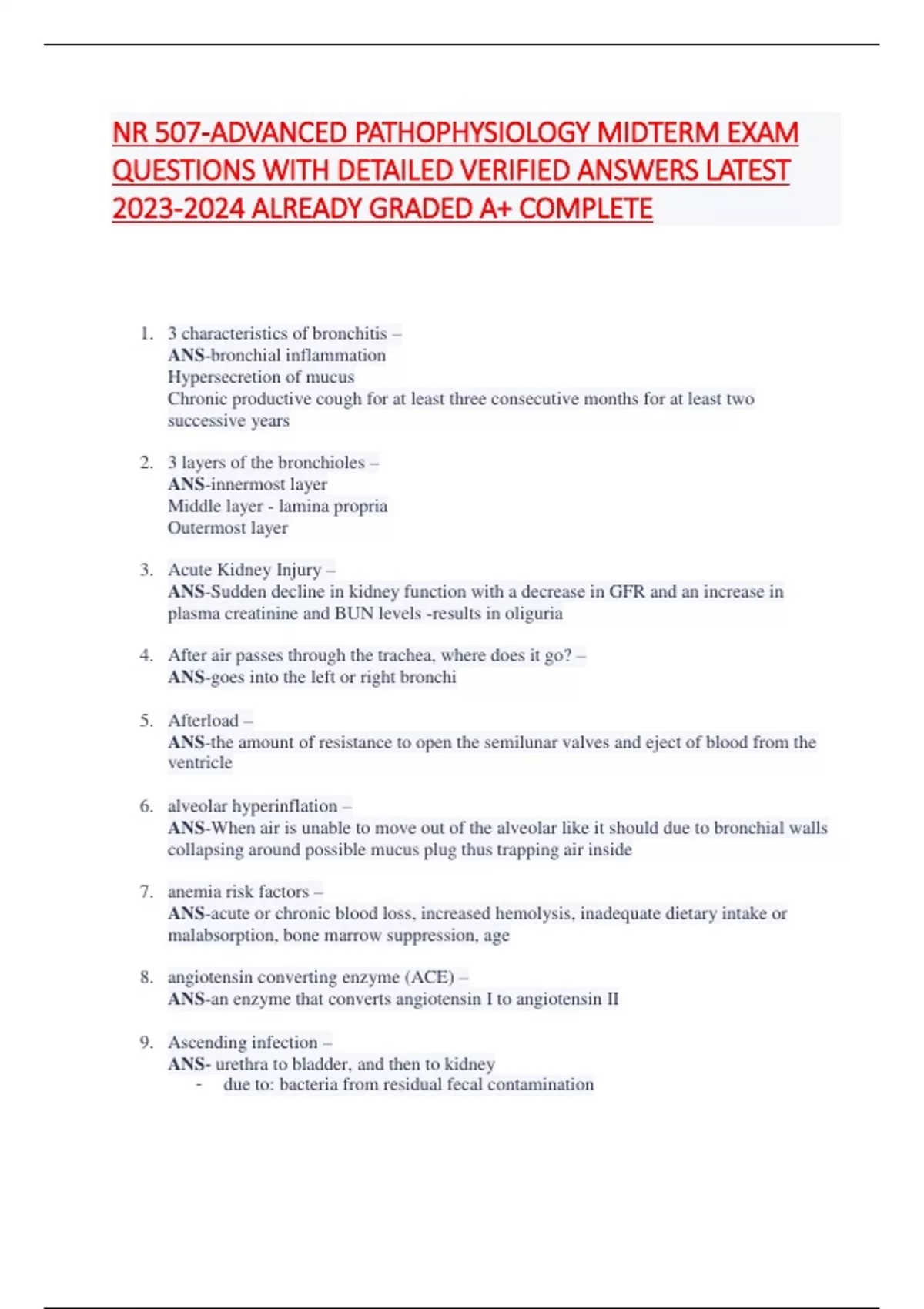 NR 507-ADVANCED PATHOPHYSIOLOGY MIDTERM EXAM QUESTIONS WITH DETAILED VERIFIED ANSWERS LATEST ALREADY GRADED A+ COMPLETE 1. 3 characteristics of bronchitis – ANS-bronchial inflammation Hypersecretion of mucus Chronic productive cough for at least three consecutive months for at least two successive years 2. 3 layers of the bronchioles – ANS-innermost layer Middle layer - lamina propria Outermost layer 3. Acute Kidney Injury – ANS-Sudden decline in kidney function with a decrease in GFR and an increase in plasma creatinine and BUN levels -results in oliguria 4. After air passes through the trachea, where does it go? – ANS-goes into the left or right bronchi 5. Afterload – ANS-the amount of resistance to open the semilunar valves and eject of blood from the ventricle 6. alveolar hyperinflation – ANS-When air is unable to move out of the alveolar like it should due to bronchial walls collapsing around possible mucus plug thus trapping air inside 7. anemia risk factors – ANS-acute or chronic blood loss, increased hemolysis, inadequate dietary intake or malabsorption, bone marrow suppression, age 8. angiotensin converting enzyme (ACE) – ANS-an enzyme that converts angiotensin I to angiotensin II 9. Ascending infection – ANS- urethra to bladder, and th