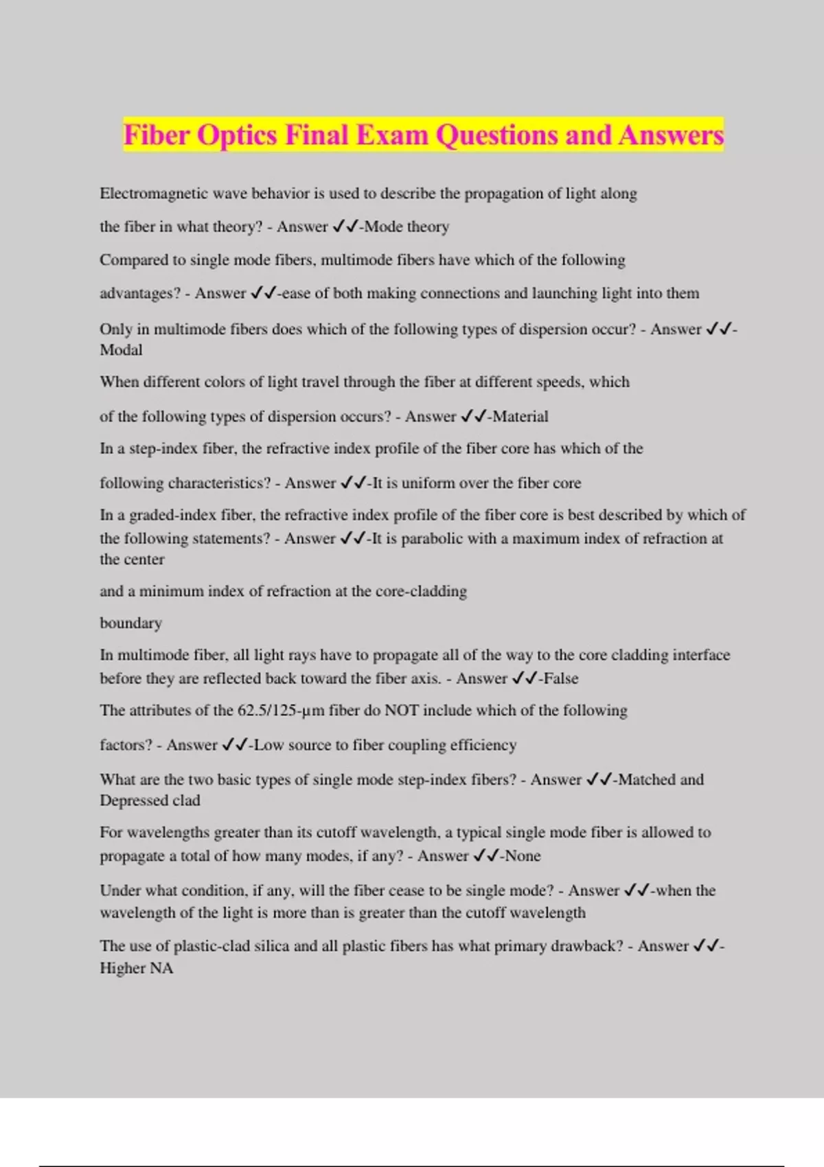 Fiber Optics Final Exam Questions and Answers Electromagnetic wave behavior is used to describe the propagation of light along the fiber in what theory? - Answer ️️ -Mode theory Compared to single mode fibers, multimode fibers have which of the following advantages? - Answer ️️ -ease of both making connections and launching light into them Only in multimode fibers does which of the following types of dispersion occur? - Answer ️️ - Modal When different colors of light travel through the fiber at different speeds, which of the following types of dispersion occurs? - Answer ️️ -Material In a step-index fiber, the refractive index profile of the fiber core has which of the following characteristics? - Answer ️️ -It is uniform over the fiber core In a graded-index fiber, the refractive index profile of the fiber core is best described by which of the following statements? - Answer ️️ -It is parabolic with a maximum index of refraction at the center and a minimum index of refraction at the core-cladding boundary In multimode fiber, all light rays have to propagate all of the way to the core cladding interface before they are reflected back toward the fiber axis. - Answer ️️ -False The attributes of the 62.5/125-μm fiber do NOT include which of the following factors? - Answer ️️ -Low source to fiber coupling efficiency What are the two basic types of single mode step-index fibers? - Answer ️️ -Matched and Depressed clad For wavelengths greater than its cutoff wavelength, a typical single mode fiber is allowed to propagate a total of how many modes, if any? - Answer ️️ -None Under what condition, if any, will the fiber cease to be single mode? - Answer ️️ -when the wavelength of the light is more than is greater than the cutoff wavelength The use of plastic-clad silica and all plastic fibers has what primary drawback? - Answer ️️ - Higher NA