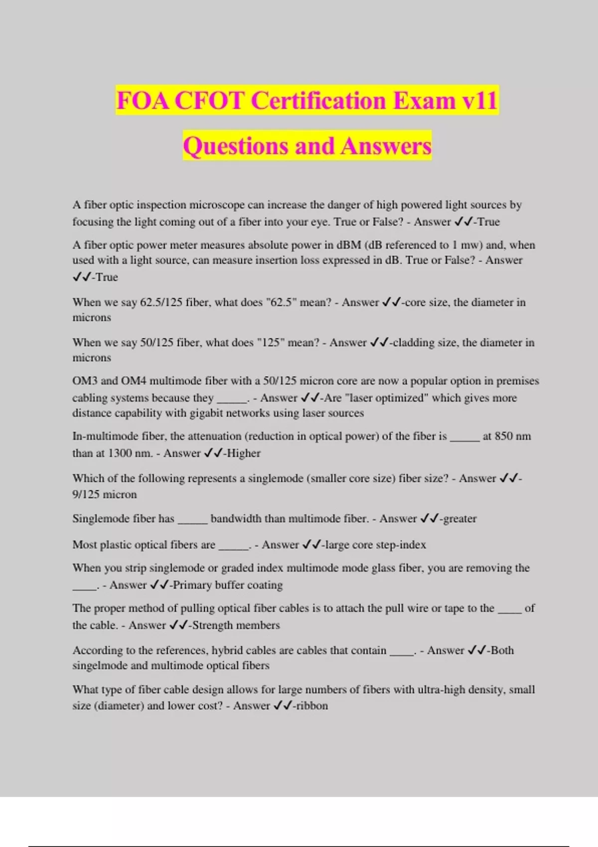 FOA CFOT Certification Exam v11 Questions and Answers A fiber optic inspection microscope can increase the danger of high powered light sources by focusing the light coming out of a fiber into your eye. True or False? - Answer ️️ -True A fiber optic power meter measures absolute power in dBM (dB referenced to 1 mw) and, when used with a light source, can measure insertion loss expressed in dB. True or False? - Answer ️️ -True When we say 62.5/125 fiber, what does "62.5" mean? - Answer ️️ -core size, the diameter in microns When we say 50/125 fiber, what does "125" mean? - Answer ️️ -cladding size, the diameter in microns OM3 and OM4 multimode fiber with a 50/125 micron core are now a popular option in premises cabling systems because they _____. - Answer ️️ -Are "laser optimized" which gives more distance capability with gigabit networks using laser sources In-multimode fiber, the attenuation (reduction in optical power) of the fiber is _____ at 850 nm than at 1300 nm. - Answer ️️ -Higher Which of the following represents a singlemode (smaller core size) fiber size? - Answer ️️ - 9/125 micron Singlemode fiber has _____ bandwidth than multimode fiber. - Answer ️️ -greater Most plastic optical fibers are _____. - Answer ️️ -large core step-index When you strip singlemode or graded index multimode mode glass fiber, you are removing the ____. - Answer ️️ -Primary buffer coating The proper method of pulling optical fiber cables is to attach the pull wire or tape to the ____ of the cable. - Answer ️️ -Strength members According to the references, hybrid cables are cables that contain ____. - Answer ️️ -Both singelmode and multimode optical fibers What type of fiber cable design allows for large numbers of fibers with ultra-high density, small size (diameter) and lower cost? - Answer ️️ -ribbon