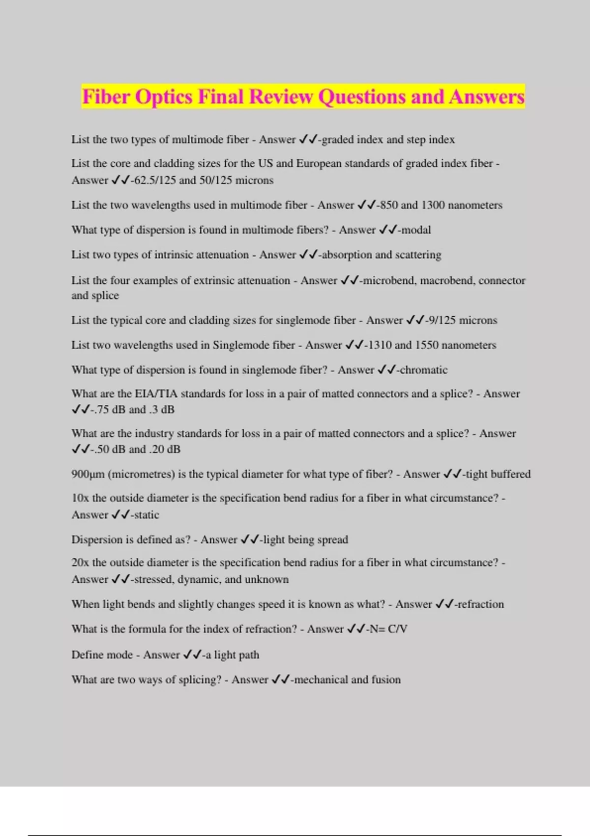 Fiber Optics Final Review Questions and Answers List the two types of multimode fiber - Answer ️️ -graded index and step index List the core and cladding sizes for the US and European standards of graded index fiber - Answer ️️ -62.5/125 and 50/125 microns List the two wavelengths used in multimode fiber - Answer ️️ -850 and 1300 nanometers What type of dispersion is found in multimode fibers? - Answer ️️ -modal List two types of intrinsic attenuation - Answer ️️ -absorption and scattering List the four examples of extrinsic attenuation - Answer ️️ -microbend, macrobend, connector and splice List the typical core and cladding sizes for singlemode fiber - Answer ️️ -9/125 microns List two wavelengths used in Singlemode fiber - Answer ️️ -1310 and 1550 nanometers What type of dispersion is found in singlemode fiber? - Answer ️️ -chromatic What are the EIA/TIA standards for loss in a pair of matted connectors and a splice? - Answer ️️ -.75 dB and .3 dB What are the industry standards for loss in a pair of matted connectors and a splice? - Answer ️️ -.50 dB and .20 dB 900μm (micrometres) is the typical diameter for what type of fiber? - Answer ️️ -tight buffered 10x the outside diameter is the specification bend radius for a fiber in what circumstance? - Answer ️️ -static Dispersion is defined as? - Answer ️️ -light being spread 20x the outside diameter is the specification bend radius for a fiber in what circumstance? - Answer ️️ -stressed, dynamic, and unknown When light bends and slightly changes speed it is known as what? - Answer ️️ -refraction What is the formula for the index of refraction? - Answer ️️ -N= C/V Define mode - Answer ️️ -a light path What are two ways of splicing? - Answer ️️ -mechanical and fusion