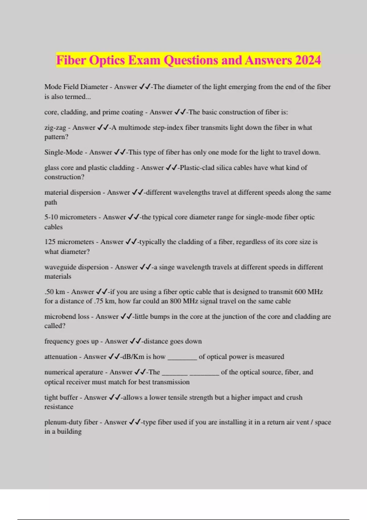 Fiber Optics Exam Questions and Answers 2024 Mode Field Diameter - Answer ️️ -The diameter of the light emerging from the end of the fiber is also termed... core, cladding, and prime coating - Answer ️️ -The basic construction of fiber is: zig-zag - Answer ️️ -A multimode step-index fiber transmits light down the fiber in what pattern? Single-Mode - Answer ️️ -This type of fiber has only one mode for the light to travel down. glass core and plastic cladding - Answer ️️ -Plastic-clad silica cables have what kind of construction? material dispersion - Answer ️️ -different wavelengths travel at different speeds along the same path 5-10 micrometers - Answer ️️ -the typical core diameter range for single-mode fiber optic cables 125 micrometers - Answer ️️ -typically the cladding of a fiber, regardless of its core size is what diameter? waveguide dispersion - Answer ️️ -a singe wavelength travels at different speeds in different materials .50 km - Answer ️️ -if you are using a fiber optic cable that is designed to transmit 600 MHz for a distance of .75 km, how far could an 800 MHz signal travel on the same cable microbend loss - Answer ️️ -little bumps in the core at the junction of the core and cladding are called? frequency goes up - Answer ️️ -distance goes down attenuation - Answer ️️ -dB/Km is how ________ of optical power is measured numerical aperature - Answer ️️ -The _______ ________ of the optical source, fiber, and optical receiver must match for best transmission tight buffer - Answer ️️ -allows a lower tensile strength but a higher impact and crush resistance plenum-duty fiber - Answer ️️ -type fiber used if you are installing it in a return air vent / space in a building