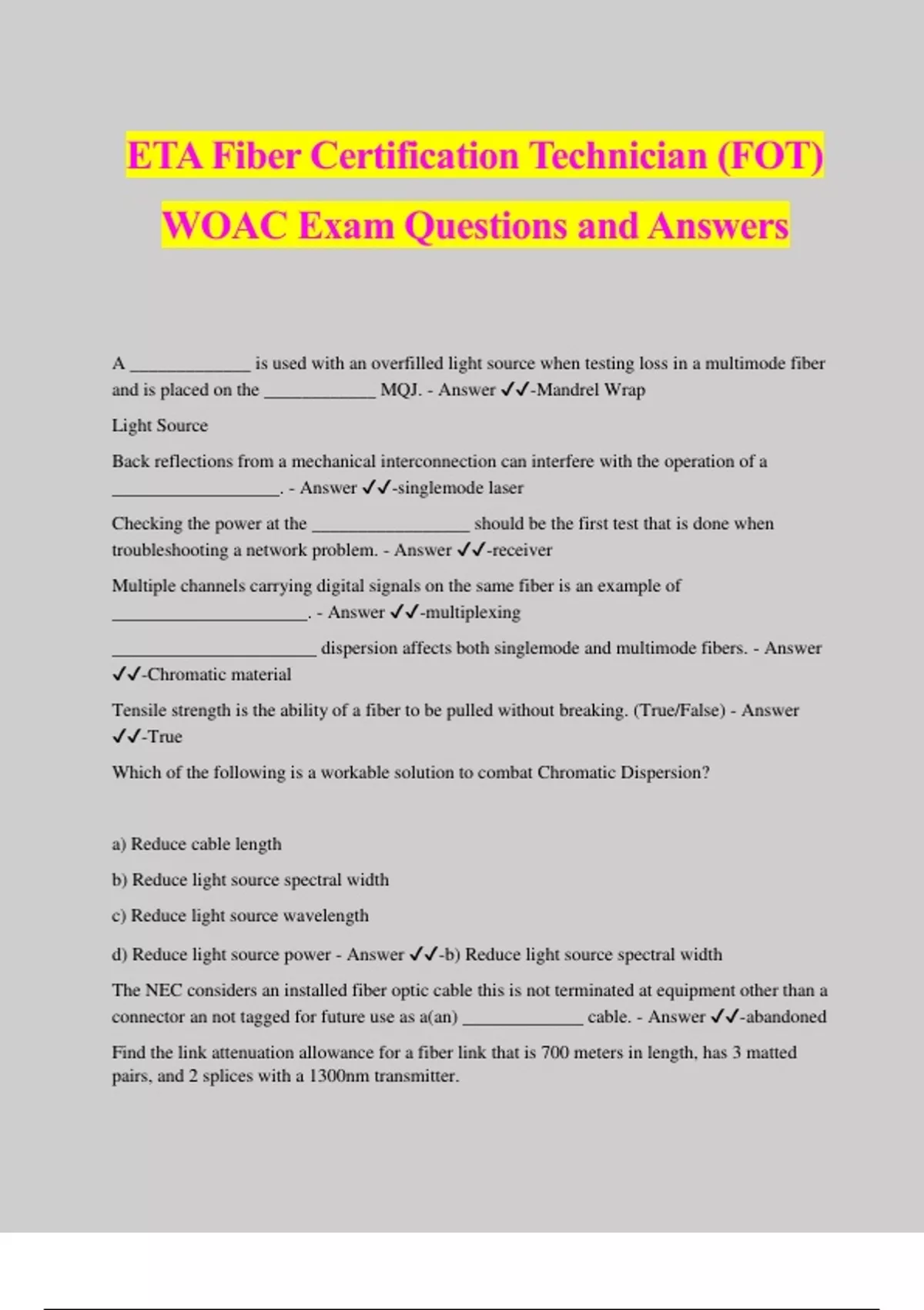 ETA Fiber Certification Technician (FOT) WOAC Exam Questions and Answers