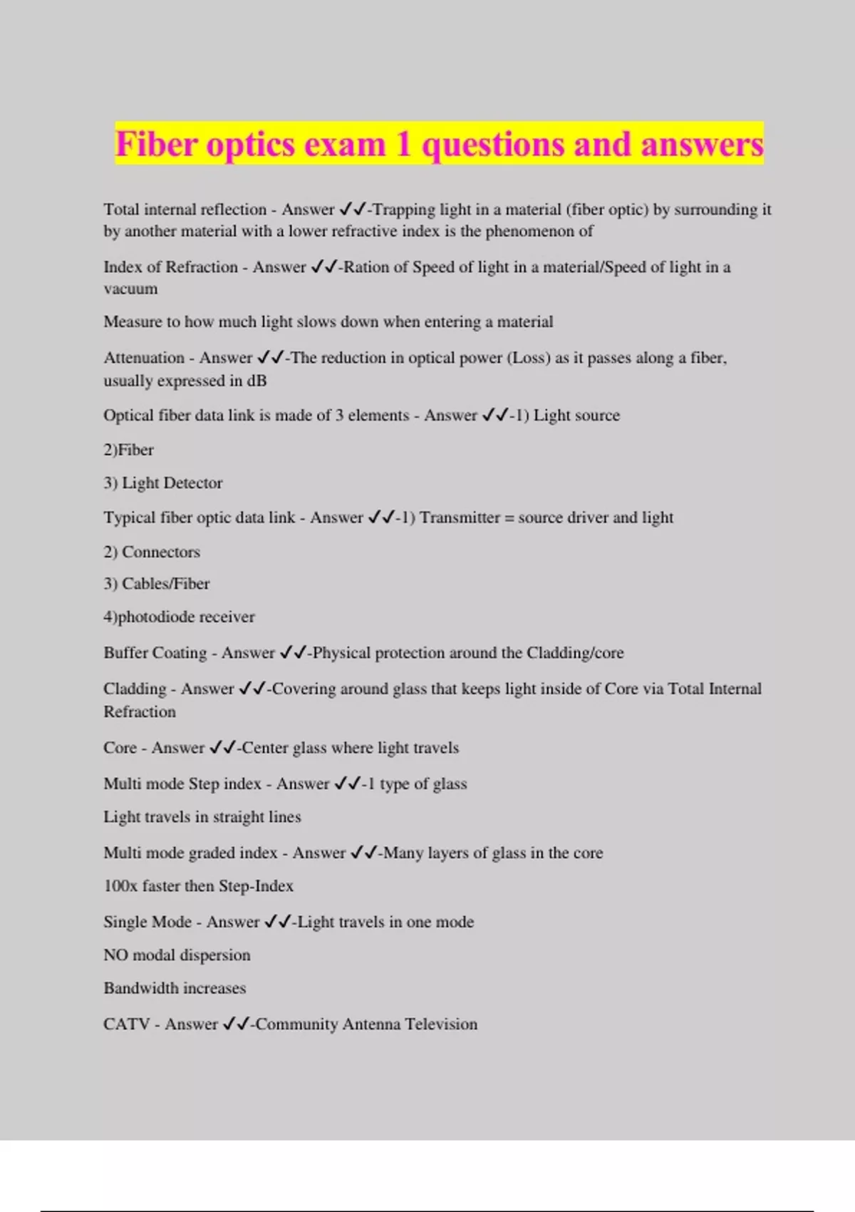Fiber optics exam 1 questions and answers Total internal reflection - Answer ️️ -Trapping light in a material (fiber optic) by surrounding it by another material with a lower refractive index is the phenomenon of Index of Refraction - Answer ️️ -Ration of Speed of light in a material/Speed of light in a vacuum Measure to how much light slows down when entering a material Attenuation - Answer ️️ -The reduction in optical power (Loss) as it passes along a fiber, usually expressed in dB Optical fiber data link is made of 3 elements - Answer ️️ -1) Light source 2)Fiber 3) Light Detector Typical fiber optic data link - Answer ️️ -1) Transmitter = source driver and light 2) Connectors 3) Cables/Fiber 4)photodiode receiver Buffer Coating - Answer ️️ -Physical protection around the Cladding/core Cladding - Answer ️️ -Covering around glass that keeps light inside of Core via Total Internal Refraction Core - Answer ️️ -Center glass where light travels Multi mode Step index - Answer ️️ -1 type of glass Light travels in straight lines Multi mode graded index - Answer ️️ -Many layers of glass in the core 100x faster then Step-Index Single Mode - Answer ️️ -Light travels in one mode NO modal dispersion Bandwidth increases CATV - Answer ️️ -Community Antenna Television