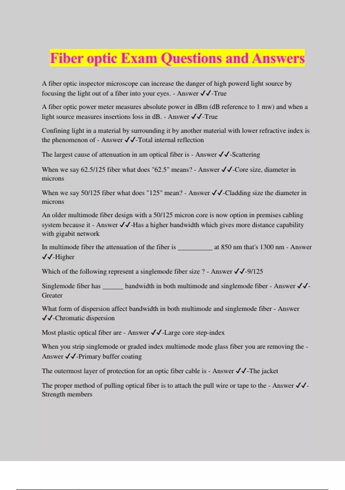 Fiber optic Exam Questions and Answers A fiber optic inspector microscope can increase the danger of high powerd light source by focusing the light out of a fiber into your eyes. - Answer ️️ -True A fiber optic power meter measures absolute power in dBm (dB reference to 1 mw) and when a light source measures insertions loss in dB. - Answer ️️ -True Confining light in a material by surrounding it by another material with lower refractive index is the phenomenon of - Answer ️️ -Total internal reflection The largest cause of attenuation in am optical fiber is - Answer ️️ -Scattering When we say 62.5/125 fiber what does "62.5" means? - Answer ️️ -Core size, diameter in microns When we say 50/125 fiber what does "125" mean? - Answer ️️ -Cladding size the diameter in microns An older multimode fiber design with a 50/125 micron core is now option in premises cabling system because it - Answer ️️ -Has a higher bandwidth which gives more distance capability with gigabit network In multimode fiber the attenuation of the fiber is __________ at 850 nm that's 1300 nm - Answer ️️ -Higher Which of the following represent a singlemode fiber size ? - Answer ️️ -9/125 Singlemode fiber has ______ bandwidth in both multimode and singlemode fiber - Answer ️️ - Greater What form of dispersion affect bandwidth in both multimode and singlemode fiber - Answer ️️ -Chromatic dispersion Most plastic optical fiber are - Answer ️️ -Large core step-index When you strip singlemode or graded index multimode mode glass fiber you are removing the - Answer ️️ -Primary buffer coating The outermost layer of protection for an optic fiber cable is - Answer ️️ -The jacket The proper method of pulling optical fiber is to attach the pull wire or tape to the - Answer ️️ - Strength members