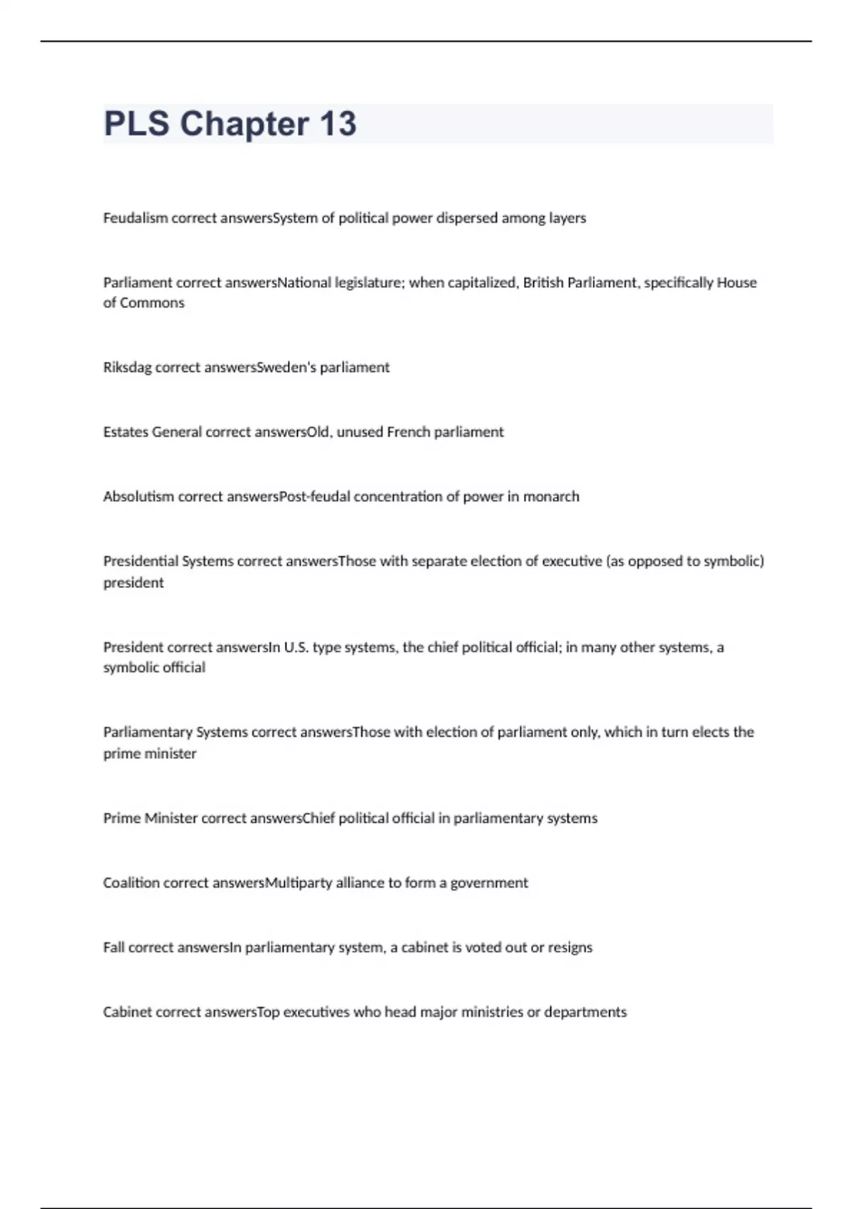 Feudalism correct answersSystem of political power dispersed among layers Parliament correct answersNational legislature; when capitalized, British Parliament, specifically House of Commons Riksdag correct answersSweden's parliament Estates General correct answersOld, unused French parliament Absolutism correct answersPost-feudal concentration of power in monarch Presidential Systems correct answersThose with separate election of executive (as opposed to symbolic) president President correct answersIn U.S. type systems, the chief political official; in many other systems, a symbolic official Parliamentary Systems correct answersThose with election of parliament only, which in turn elects the prime minister Prime Minister correct answersChief political official in parliamentary systems Coalition correct answersMultiparty alliance to form a government Fall correct answersIn parliamentary system, a cabinet is voted out or resigns Cabinet correct answersTop executives who head major ministries or departments