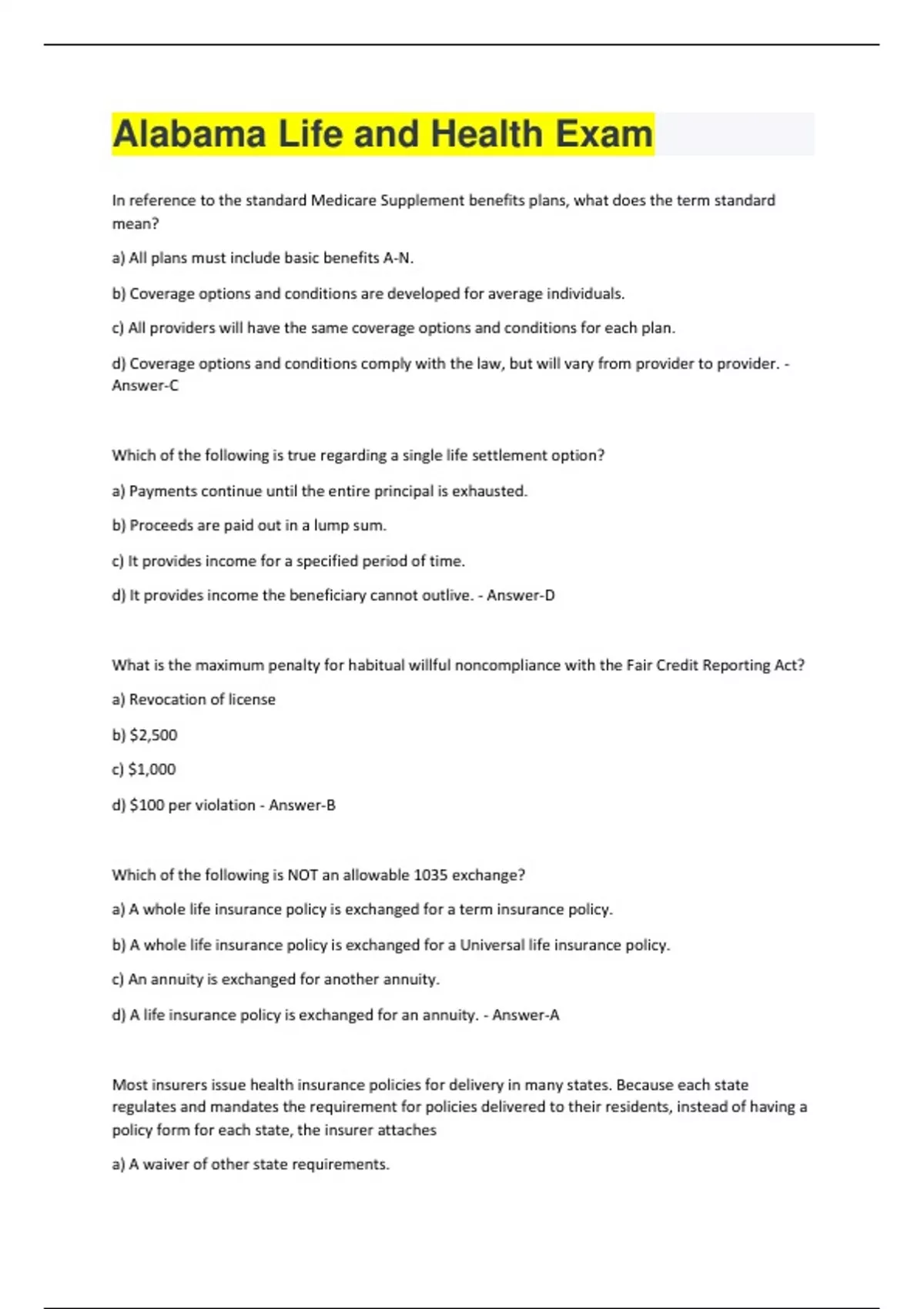 In reference to the standard Medicare Supplement benefits plans, what does the term standard mean? a) All plans must include basic benefits A-N. b) Coverage options and conditions are developed for average individuals. c) All providers will have the same coverage options and conditions for each plan. d) Coverage options and conditions comply with the law, but will vary from provider to provider. - Answer-C Which of the following is true regarding a single life settlement option? a) Payments continue until the entire principal is exhausted. b) Proceeds are paid out in a lump sum. c) It provides income for a specified period of time. d) It provides income the beneficiary cannot outlive. - Answer-D What is the maximum penalty for habitual willful noncompliance with the Fair Credit Reporting Act? a) Revocation of license b) $2,500 c) $1,000 d) $100 per violation - Answer-B Which of the following is NOT an allowable 1035 exchange? a) A whole life insurance policy is exchanged for a term insurance policy. b) A whole life insurance policy is exchanged for a Universal life insurance policy. c) An annuity is exchanged for another annuity. d) A life insurance policy is exchanged for an annuity. - Answer-A Most insurers issue health insurance policies for delivery in many states. Because each state regulates and mandates the requirement for policies delivered to their residents, instead of having a policy form for each state, the insurer attaches a) A waiver of other state requirements.b) Nothing. An insurer's policy only needs to conform to the regulations of the state where the insurer is domiciled. c) Conformity with State Statutes provision. d) Miscellaneous optional provision. - Answer-C Which concept is associated with "exclusion ratio"? a) Dividend distribution b) How exclusion riders affect an insurance premium c) Policy provisions d) Annuities payments - Answer-D When a homeowner purchases insurance on his home, what risk management technique is he practicing? a) Retention b) Transfer c) Avoidance d) Sharing - Answer-B