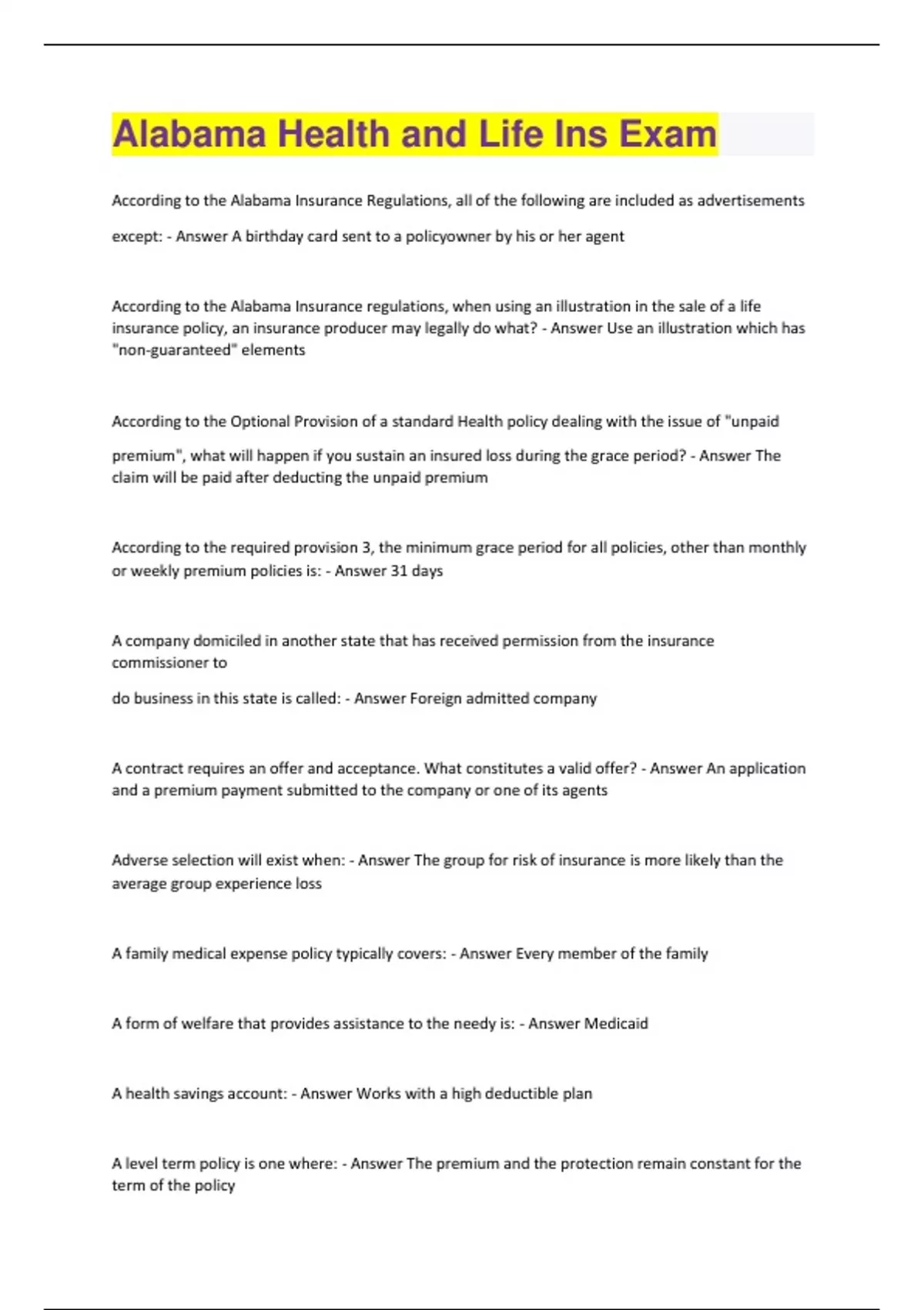 Alabama Health and Life Ins Exam Questions And Answers