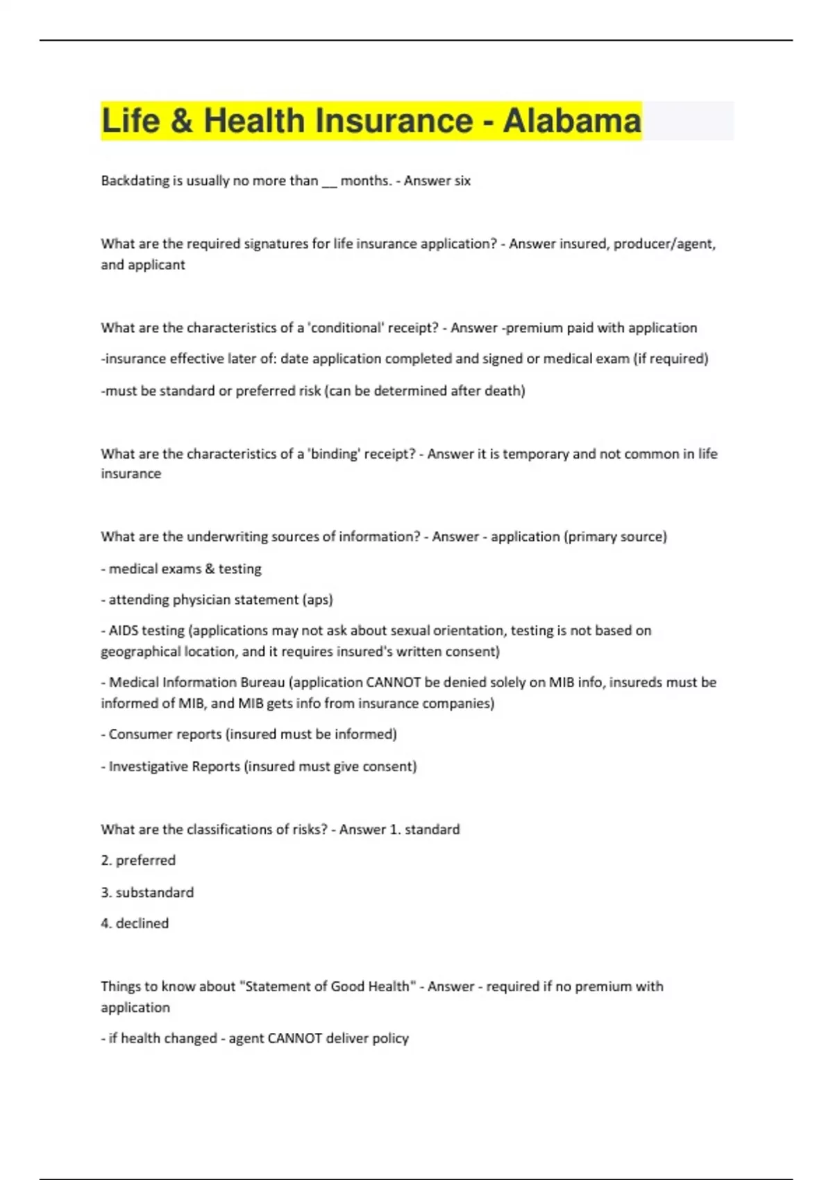 Backdating is usually no more than __ months. - Answer six What are the required signatures for life insurance application? - Answer insured, producer/agent, and applicant What are the characteristics of a 'conditional' receipt? - Answer -premium paid with application -insurance effective later of: date application completed and signed or medical exam (if required) -must be standard or preferred risk (can be determined after death) What are the characteristics of a 'binding' receipt? - Answer it is temporary and not common in life insurance What are the underwriting sources of information? - Answer - application (primary source) - medical exams & testing - attending physician statement (aps) - AIDS testing (applications may not ask about sexual orientation, testing is not based on geographical location, and it requires insured's written consent) - Medical Information Bureau (application CANNOT be denied solely on MIB info, insureds must be informed of MIB, and MIB gets info from insurance companies) - Consumer reports (insured must be informed) - Investigative Reports (insured must give consent) What are the classifications of risks? - Answer 1. standard 2. preferred 3. substandard 4. declined Things to know about "Statement of Good Health" - Answer - required if no premium with application - if health changed - agent CANNOT deliver policyThings to know about the effective date of coverage - Answer - terms of conditional receipt is issued - substandard and pays additional premium - date of policy delivery - no receipt - policy delivery date if premium paid at delivery Things to know about Fair Credit Reporting Act - Answer - third party info - notice to applicant required - consumers have rights and can dispute information in files - penalty: fines (max of $5,000) and/or imprisonment (one year) Things to know about U.S. Patriot Act - Answer - designed to prevent and detect money laundering and financing of terrorism - report suspicious activity Things to know about ERISA - Answer - protects participants in employee benefit plans - qualified pension plans and group insurance - reporting and disclosure information for plan participants Things to know about insurable interest - Answer - a risk of loss (assumed in one's self and relationships) - must be proven before policy can be purchased - the relationship doesn't have to exist at death What are personal uses of life insurance? - Answer - survivor protection - mortgage payoff - estate creation - estate conservation - liquidity - cash accumulation