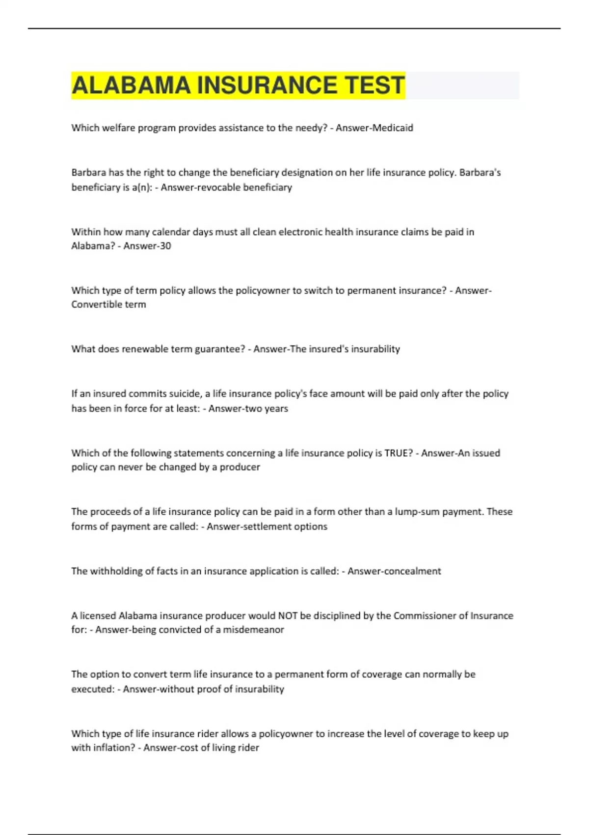 Which welfare program provides assistance to the needy? - Answer-Medicaid Barbara has the right to change the beneficiary designation on her life insurance policy. Barbara's beneficiary is a(n): - Answer-revocable beneficiary Within how many calendar days must all clean electronic health insurance claims be paid in Alabama? - Answer-30 Which type of term policy allows the policyowner to switch to permanent insurance? - AnswerConvertible term What does renewable term guarantee? - Answer-The insured's insurability If an insured commits suicide, a life insurance policy's face amount will be paid only after the policy has been in force for at least: - Answer-two years Which of the following statements concerning a life insurance policy is TRUE? - Answer-An issued policy can never be changed by a producer The proceeds of a life insurance policy can be paid in a form other than a lump-sum payment. These forms of payment are called: - Answer-settlement options The withholding of facts in an insurance application is called: - Answer-concealment A licensed Alabama insurance producer would NOT be disciplined by the Commissioner of Insurance for: - Answer-being convicted of a misdemeanor The option to convert term life insurance to a permanent form of coverage can normally be executed: - Answer-without proof of insurability Which type of life insurance rider allows a policyowner to increase the level of coverage to keep up with inflation? - Answer-cost of living riderWhat is the minimum age requirement for a minor in Alabama to purchase a life insurance policy? - Answer-15 Which of the following best describes a Health Maintenance Organization (HMO)? - Answer-Provides full medical services that stress preventative medicine Medicare Advantage (Medicare Part C) allows the utilization of benefits through a(n): - AnswerHMO, PPO, or traditional insurer