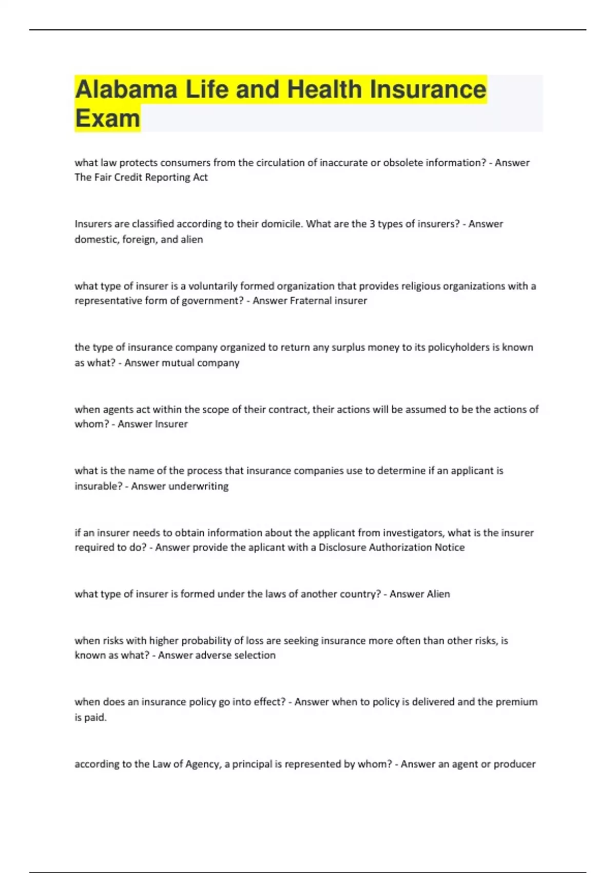 what law protects consumers from the circulation of inaccurate or obsolete information? - Answer The Fair Credit Reporting Act Insurers are classified according to their domicile. What are the 3 types of insurers? - Answer domestic, foreign, and alien what type of insurer is a voluntarily formed organization that provides religious organizations with a representative form of government? - Answer Fraternal insurer the type of insurance company organized to return any surplus money to its policyholders is known as what? - Answer mutual company when agents act within the scope of their contract, their actions will be assumed to be the actions of whom? - Answer Insurer what is the name of the process that insurance companies use to determine if an applicant is insurable? - Answer underwriting if an insurer needs to obtain information about the applicant from investigators, what is the insurer required to do? - Answer provide the aplicant with a Disclosure Authorization Notice what type of insurer is formed under the laws of another country? - Answer Alien when risks with higher probability of loss are seeking insurance more often than other risks, is known as what? - Answer adverse selection when does an insurance policy go into effect? - Answer when to policy is delivered and the premium is paid. according to the Law of Agency, a principal is represented by whom? - Answer an agent or producerwhat type of risk is insurable? - Answer pure who owns stock companies? - Answer stockholders what entities make up the Medical Information Bureau? - Answer Insurers