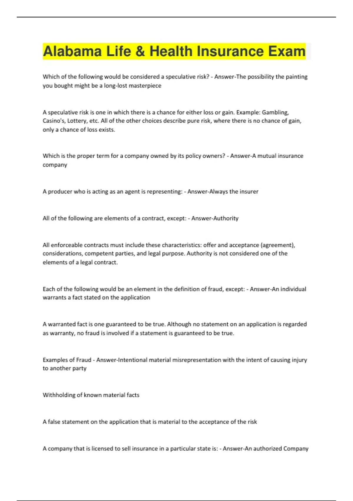 Which of the following would be considered a speculative risk? - Answer-The possibility the painting you bought might be a long-lost masterpiece A speculative risk is one in which there is a chance for either loss or gain. Example: Gambling, Casino's, Lottery, etc. All of the other choices describe pure risk, where there is no chance of gain, only a chance of loss exists. Which is the proper term for a company owned by its policy owners? - Answer-A mutual insurance company A producer who is acting as an agent is representing: - Answer-Always the insurer All of the following are elements of a contract, except: - Answer-Authority All enforceable contracts must include these characteristics: offer and acceptance (agreement), considerations, competent parties, and legal purpose. Authority is not considered one of the elements of a legal contract. Each of the following would be an element in the definition of fraud, except: - Answer-An individual warrants a fact stated on the application A warranted fact is one guaranteed to be true. Although no statement on an application is regarded as warranty, no fraud is involved if a statement is guaranteed to be true. Examples of Fraud - Answer-Intentional material misrepresentation with the intent of causing injury to another party Withholding of known material facts A false statement on the application that is material to the acceptance of the risk A company that is licensed to sell insurance in a particular state is: - Answer-An authorized CompanyIn order to be valid, a contract must be between individuals considered legally able to enter into an agreement. This principle is known as: - Answer-Competent parties An insurance contract is an aleatory contract. This means: - Answer-Equal value is not given by both parties to the contract Aleatory: contract of unequal values exchanged The ____________ market is a private source of coverage of last resort for individuals or businesses that have been rejected by voluntary market insurers. - Answer-Residual To address adverse selection what can an insurer legally do? - Answer-Establish and enforce sound underwriting practices Underwriting helps to protect the insurer against adverse selection and accepting risks that are more likely than average to suffer losses. A contract that is drafted by an insurer and receives no input or alteration from the insured, is considered a(n): - Answer-Contract of Adhesion