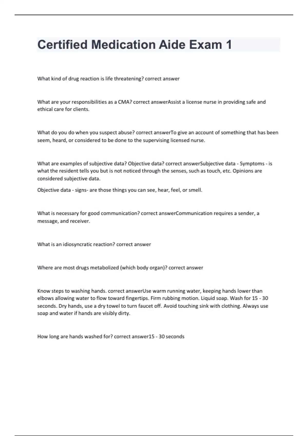 CERTIFIED MEDICATION AIDE EXAM 1 2024 ACTUAL EXAM What kind of drug reaction is life threatening? - CORRECT ANSWERWhat are your responsibilities as a CMA? - CORRECT ANSWER-Assist a license nurse in providing safe and ethical care for clients. What do you do when you suspect abuse? - CORRECT ...