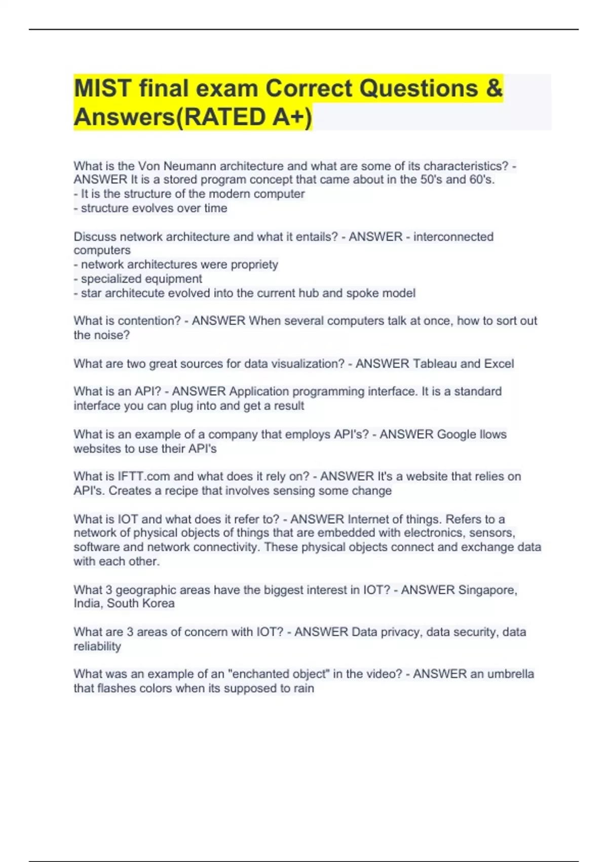 What is the Von Neumann architecture and what are some of its characteristics? - ANSWER It is a stored program concept that came about in the 50's and 60's. - It is the structure of the modern computer - structure evolves over time Discuss network architecture and what it entails? - ANSWER - interconnected computers - network architectures were propriety - specialized equipment - star architecute evolved into the current hub and spoke model What is contention? - ANSWER When several computers talk at once, how to sort out the noise? What are two great sources for data visualization? - ANSWER Tableau and Excel What is an API? - ANSWER Application programming interface. It is a standard interface you can plug into and get a result What is an example of a company that employs API's? - ANSWER Google llows websites to use their API's What is IFTT.com and what does it rely on? - ANSWER It's a website that relies on API's. Creates a recipe that involves sensing some change What is IOT and what does it refer to? - ANSWER Internet of things. Refers to a network of physical objects of things that are embedded with electronics, sensors, software and network connectivity. These physical objects connect and exchange data with each other. What 3 geographic areas have the biggest interest in IOT? - ANSWER Singapore, India, South Korea What are 3 areas of concern with IOT? - ANSWER Data privacy, data security, data reliability What was an example of an "enchanted object" in the video? - ANSWER an umbrella that flashes colors when its supposed to rain Discuss the internet of cars - ANSWER call car to autonomiously pick you up, enter destination and are routed through traffic flows, car travels with "platoon" of vehicles, connected with everything you need in your car, dropped off at doorstep of destination In regards to IOT and data what does every device do? - ANSWER generates data In the analytics 3.0 article what does ABD and BBD mean? - ANSWER After Big Data and Before Big Data What characterizes Analytic s 1.0? - ANSWER -Business intelligence -data warehouses -competing on analytic s What characterizes Analytic s 2.0? - ANSWER - unstructured data -in-memory computing -data products What characterizes Analytic s 3.0? - ANSWER -Devices and algorithms -optimization What is Hadoop and what did it accomplish? - ANSWER an open source software framework for fast batch data processing across parallel servers. It helped develop and analyze big data What are some companies that are using Anallytics 3.0? - ANSWER GE, UPS, Bosch group, Schneider electric, What is Digital Ubiquity and what is involved in it? - ANSWER Refers to digital data 1. perfect transmission 2. replication without degradation 3. marginal cost less than 0 In regards to software development what are companies moving towards? - ANSWER -"low code" or "no code" platform -allows MAC's and Windows to talk Why does target care about pregnancy? - ANSWER Old routines are in flux; buying habits fall apart. "We knew that if we could identify them in their second trimester, there's a good chance we could capture them for years." How does Target figure out when a customer is due? - ANSWER 25-item algorithm can predict due date: Prenatal vitamin purchases (20 weeks), High quantities of unscented lotion (2nd tri), extra-large bags of cotton balls, etc. Algorithm can be supplemented with data from online cookies, purchased demographic data, home purchase data, car registration data, etc. "Predictive analytics department" In data model elements what are the identifying parts? - ANSWER entity (top) primary key (below that) attribute(s) (below that) relationship is between entities What is cardinality and where is it placed on the model? - ANSWER -refers to the maximum number of times an instance in one entity can be associated with instances in the related entity -on the inside closest to the entity What is modality? - ANSWER -refers to the minimum number of times an instance in one entity can be associated with an instance in the related entity -beside the cardinality side In regards to data what defined customer relationships in the old way? - ANSWER unidirectional marketing message products that satisfy/delight company generated product and content four P's (product, price, place, promotion) trust in experts majority fallacy What is the majority fallacy? - ANSWER builds a product that appeal to the whole market In regards to data what defines customer relationships in the new way? - ANSWER four C's (consumer, cost, convenience, communication) multi-directional conversation "user generated content" trust in friends experiences that engage user product co-creation niche markets (long tail) what is a niche market? - ANSWER groups of people that buy certain products what is crm and what is it comprised of? - ANSWER customer relationship model -customer sales data -broad market/ se