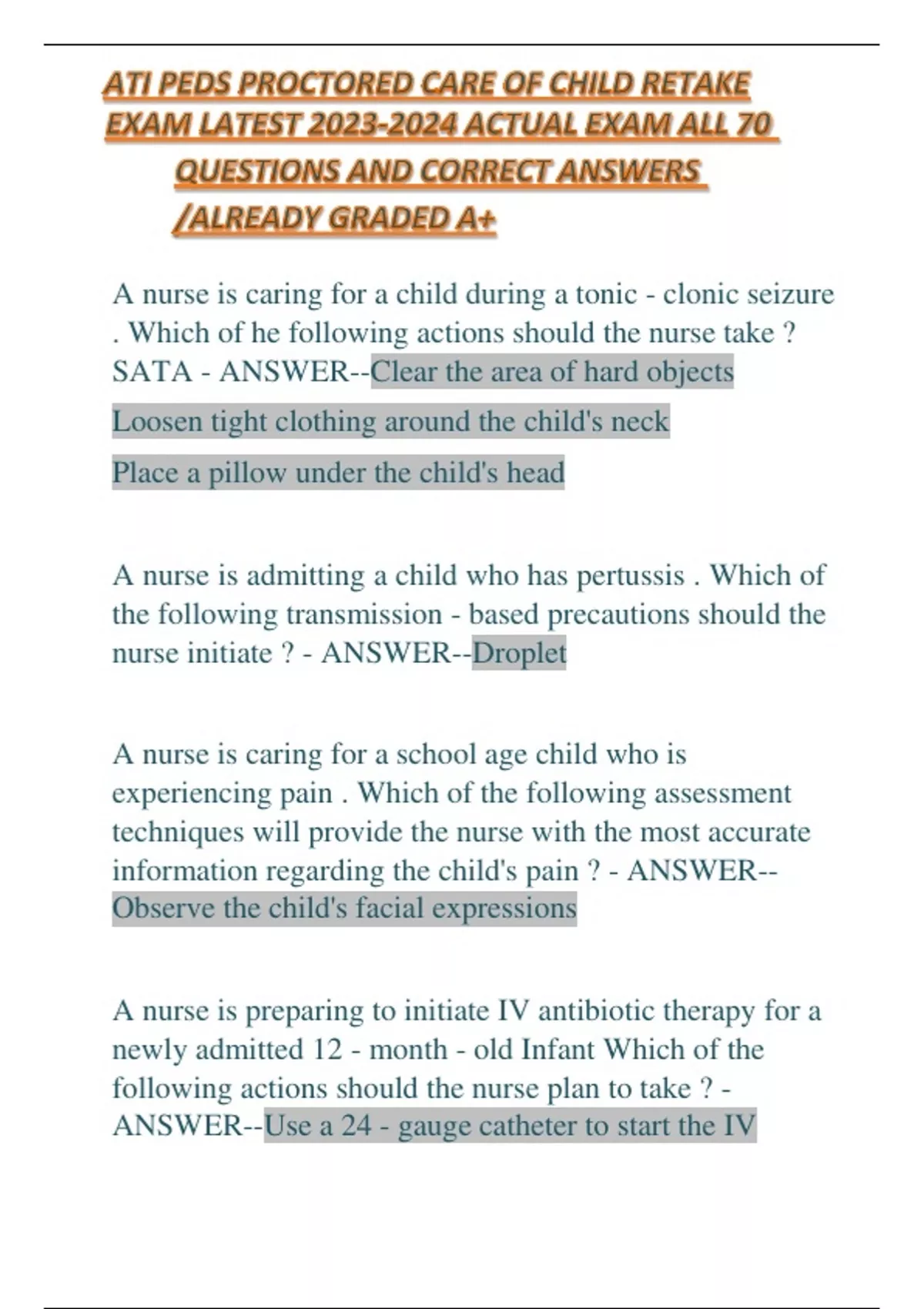 ATI PEDS PROCTORED CARE OF CHILD RETAKE EXAM LATEST ACTUAL EXAM ALL 70 QUESTIONS AND CORRECT ANSWERS /ALREADY GRADED A+