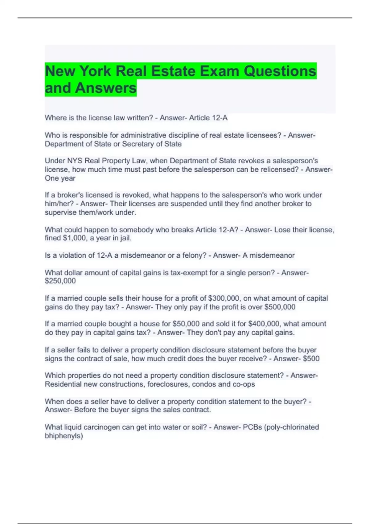 New York Real Estate Exam Questions and Answers