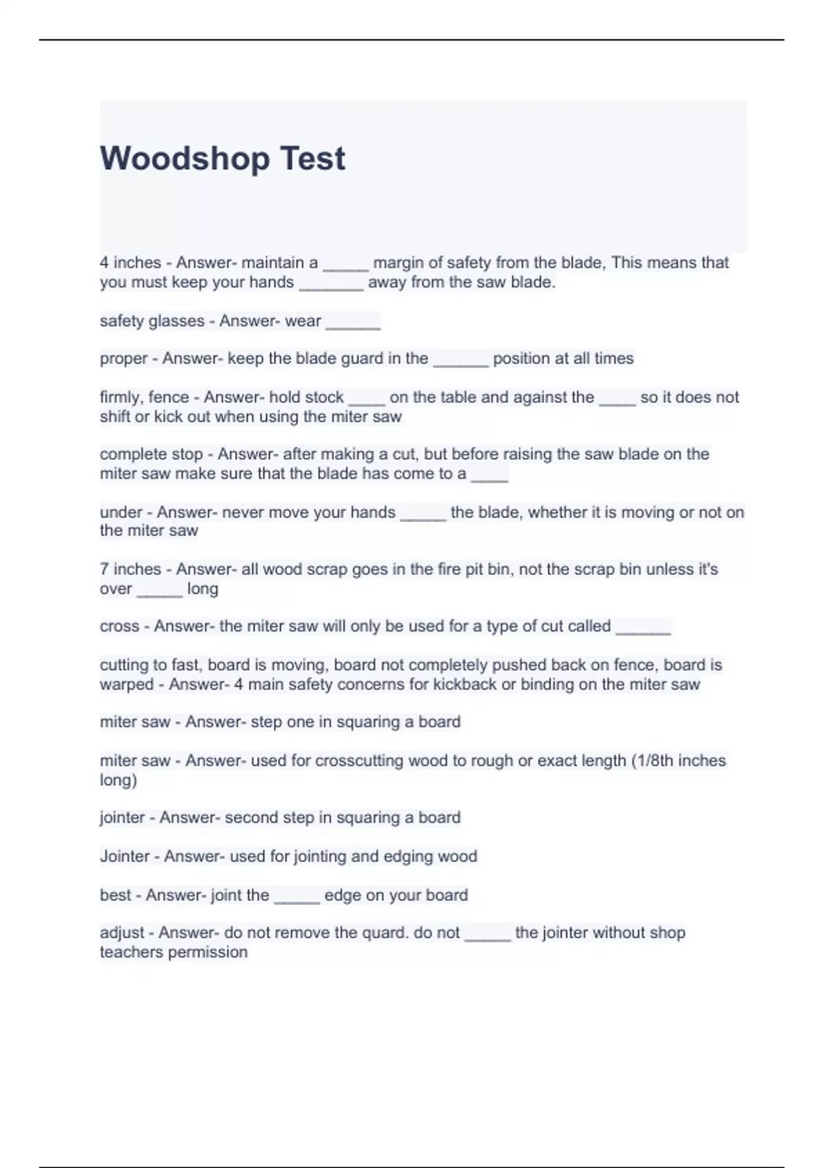 Woodshop Test with 100% correct Answers