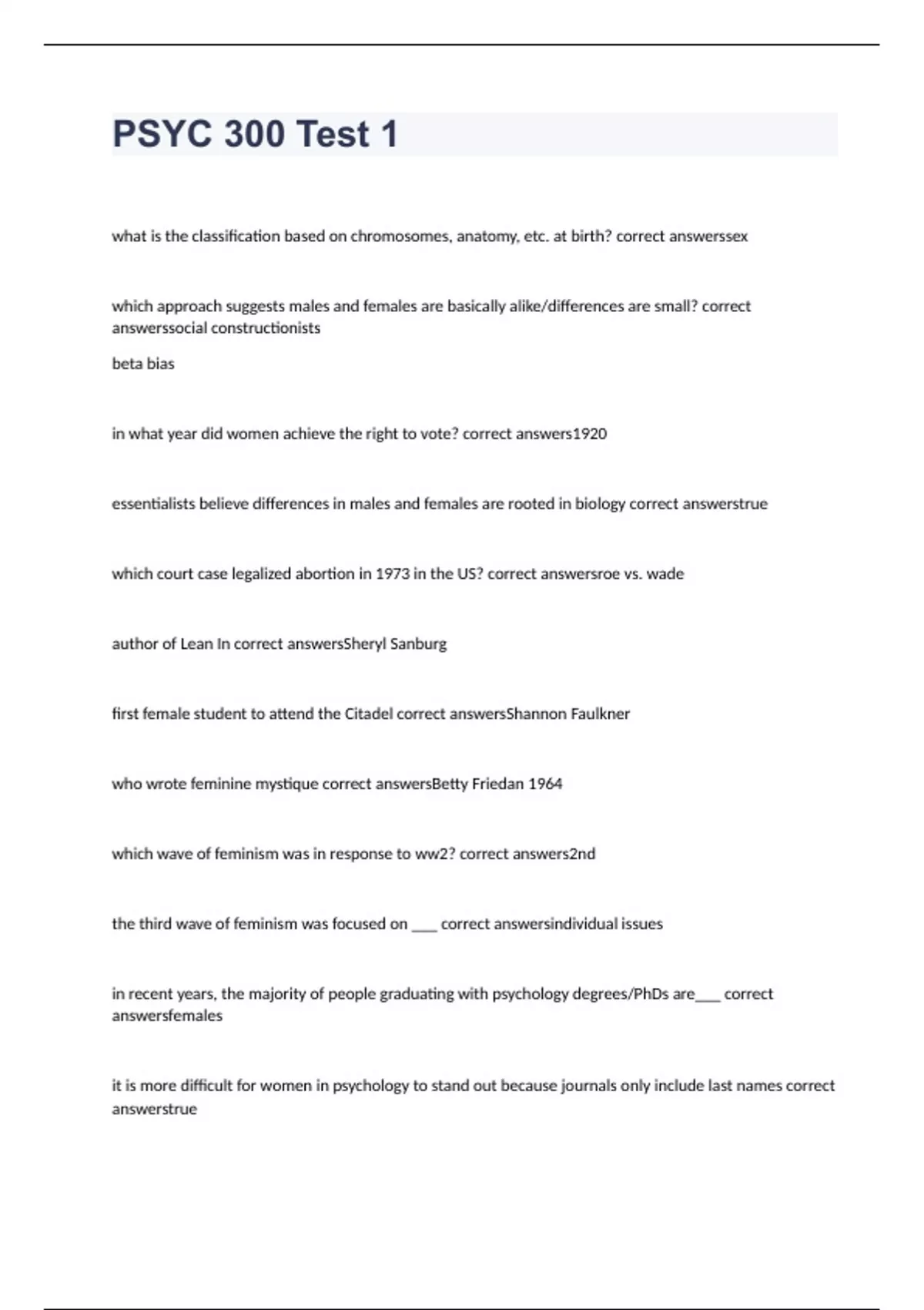 what is the classification based on chromosomes, anatomy, etc. at birth? correct answerssex which approach suggests males and females are basically alike/differences are small? correct answerssocial constructionists beta bias in what year did women achieve the right to vote? correct answers1920 essentialists believe differences in males and females are rooted in biology correct answerstrue which court case legalized abortion in 1973 in the US? correct answersroe vs. wade author of Lean In correct answersSheryl Sanburg first female student to attend the Citadel correct answersShannon Faulkner who wrote feminine mystique correct answersBetty Friedan 1964 which wave of feminism was in response to ww2? correct answers2nd the third wave of feminism was focused on ___ correct answersindividual issues