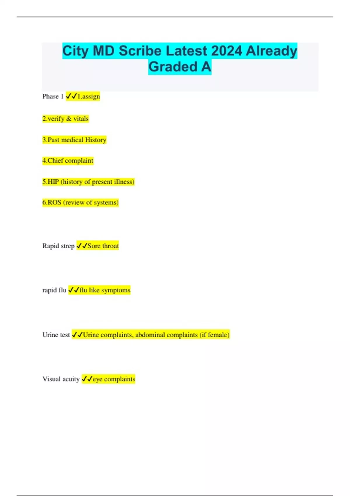 City MD Scribe Latest 2024 Already Graded A Phase 1 n y & vitals 3.Past medical History 4.Chief complaint 5.HIP (history of present illness) 6.ROS (review of systems) Rapid strep Sore throat rapid flu flu like symptoms Urine test Urine complaints, abdominal complaints (if female) Visual acuity eye complaints Past medical history (in order) 1. current medication 2.Medical conditions 3.Allergies 4.Surgical history 5. family history 6. social history HPI (in order) Onset severity nature Pertinent findings ROS (established vs. complex vs. New) Established pt. 3 systems New PT. gets 10 systems Complex case: 10 systems Phase 2 1) present the case 2)update the HPI 3)physical exam 4) procedures 5)Assessment 6) Post diagnostic orders 7)Treatment (Rx) 8) preventative medicine What to show and ask the provider -assessment -prescriptions -possible drug interactions -treatment -post diagnostic orders -referrals -ENM code if you are unsure Phase 3 1) Other procedures (if you need to contact other team members 2) Billing code 3)Send Rx 4)Discharge Stat orders (who to inform) Stat lab- MA and manager Stat Advance imaging- PCR and Manager Stat Refferal- PCR and manager Stat X-ray- X-ray tec and Manager *inform them at the beginning of phase 3 Types of Forms in scribe binder Uninsured super bill (USB) Non-covered service waiver (NCS) HIV consent form HSV handout PPD reading form Against medical Advice (AMA) Occupational medicine Self-pay Super bill Physicians Procedure Consent form Symptomatic STD testing HPI 1- Primary Complaint HPI2 - STD questionnaire Asymptomatic STD testing HPI 1- STD testing/counseling HPI 2- STD questionnaire Work related injury/Workers Compensation HPI 1- Primary complaint HPI 2- Work related injury IN assessment put "Y99.0 work related injury" MVA/ No fault Insurance HPI 1-Primary complaint HPI 2- MVA -In additional diagnosis put "motor vehicle accident -should be indicated on office page Black flag A patient workup is required. Person who brought in the patient likely obtaining the vital signs but nothing else Blue flag Signal that a medical scribe is in the room. Stays up until patient is discharged yellow and Green flag Used by providers to signal which provider is in what room. stays until patient is discharged White flag procedure that could take more than 10 minutes or needs a MA/X-ray tech red flag The next room that the provider has to go into All flags and door is open The room is out of order All flags and the door is closed Do not disturb Exam chair Drawer (Front) Urine cups Speculums VCM swab BZK wipes Exam chair Drawers (Back) Elastic bandages Ice packs Nebulizer masks Gowns and Chuxs Exam chair (back flap) Nebulizer machine Counter top Rapid flu Rapid strep Pulse Ox Go-TO drawer Culture swabs Tourniquet Band-aids Medical tape Lube Cuvettes Appirm and Aptima Bacitracin Lancets Alcohol pads suture drawer Gauze patch Skin staple remover Incision and drainage kit Skin stapler splash guard ChloraPrep Sutures Cautery Pen Cabinets Top: Solutions, suture tray, IV bag Middle: Vacutainer, Butterfly needle, Syringes, IV tubing Bottom: Lidocaine, IV catheter, Tegaderm Lab Sharps container Alcohol UA strips UCG Packet UA machine Urine collection Kit
