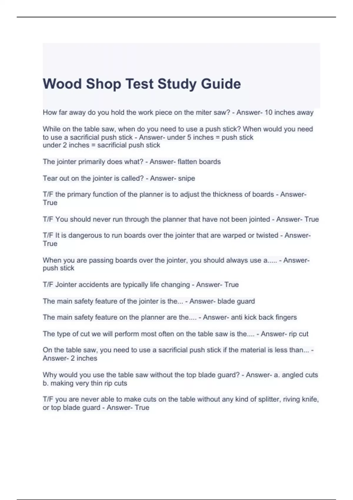 wood shop test study guide