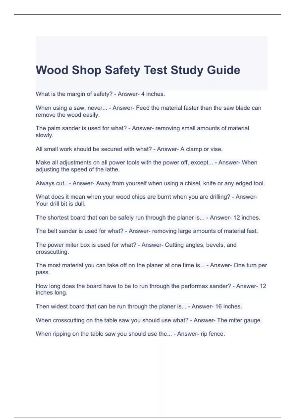 wood shop safety test study guide