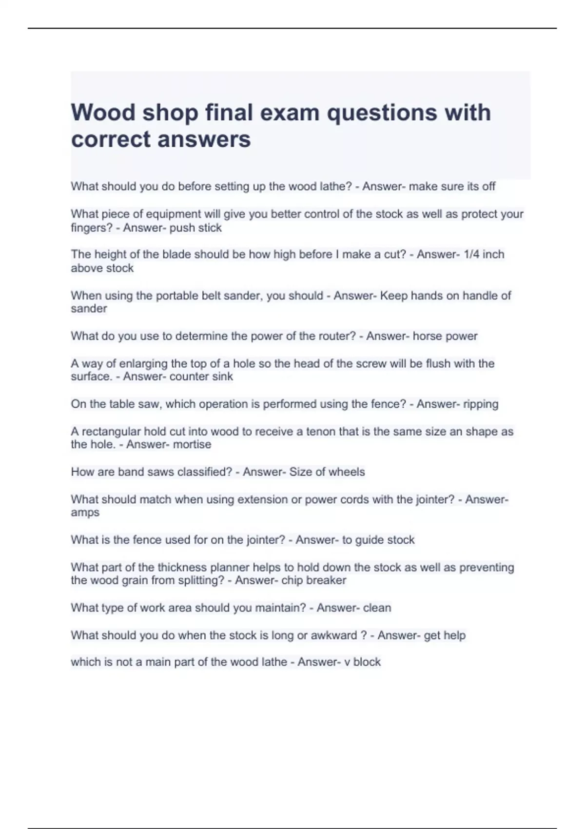 wood shop final exam questions with correct answer