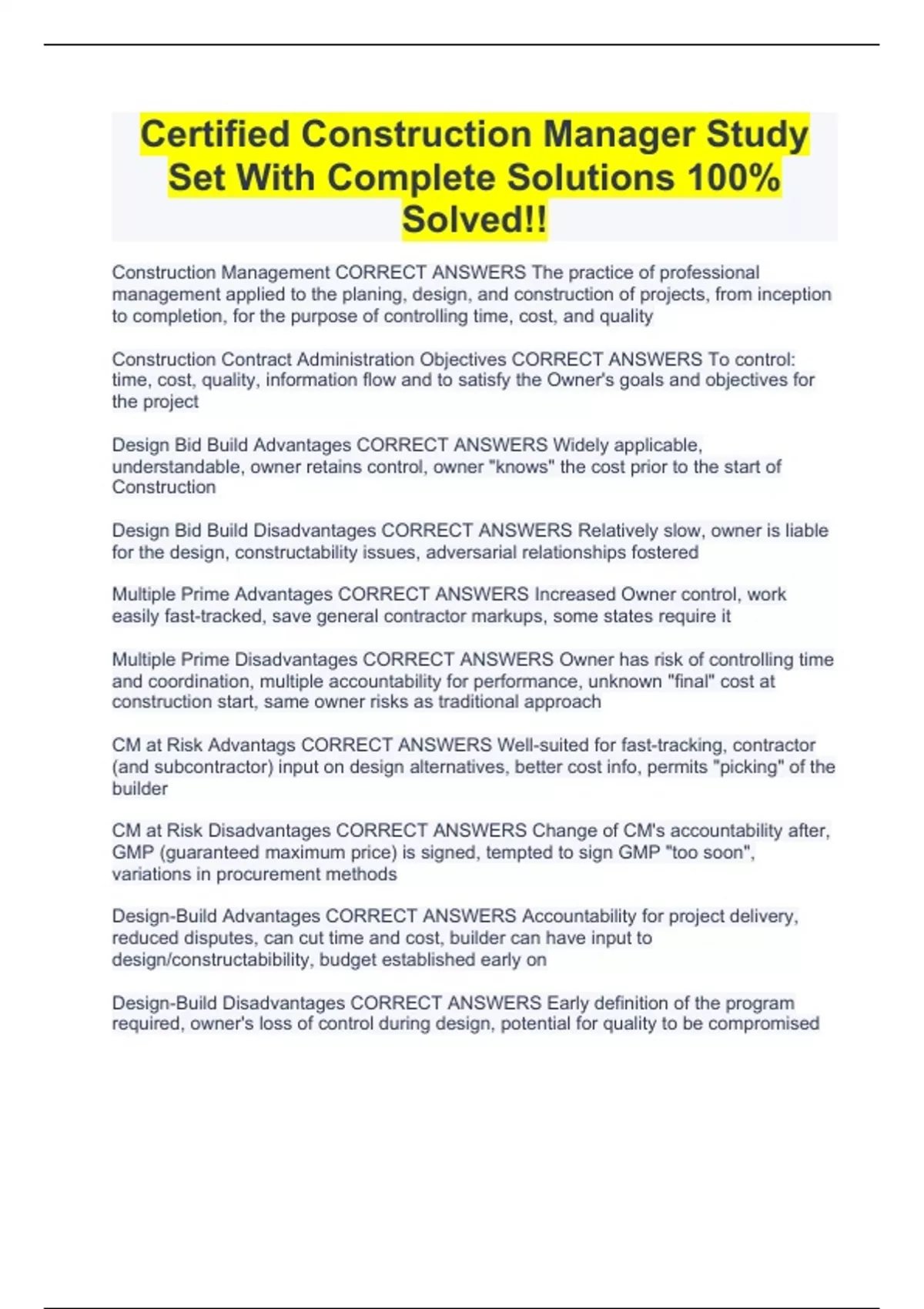 Certified Construction Manager Study Set With Complete Solutions 100% Solved!!