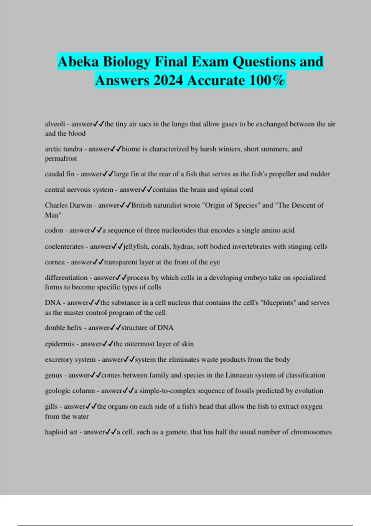 Abeka Biology Final Exam Questions and Answers 2024 Accurate 100% alveoli - answerthe tiny air sacs in the lungs that allow gases to be exchanged between the air and the blood arctic tundra - answerbiome is characterized by harsh winters, short summers, and permafrost caudal fin - answerlarge fin at the rear of a fish that serves as the fish's propeller and rudder central nervous system - answercontains the brain and spinal cord Charles Darwin - answerBritish naturalist wrote "Origin of Species" and "The Descent of Man" codon - answera sequence of three nucleotides that encodes a single amino acid coelenterates - answerjellyfish, corals, hydras; soft bodied invertebrates with stinging cells cornea - answertransparent layer at the front of the eye differentiation - answerprocess by which cells in a developing embryo take on specialized forms to become specific types of cells DNA - answerthe substance in a cell nucleus that contains the cell's "blueprints" and serves as the master control program of the cell double helix - answerstructure of DNA epidermis - answerthe outermost layer of skin