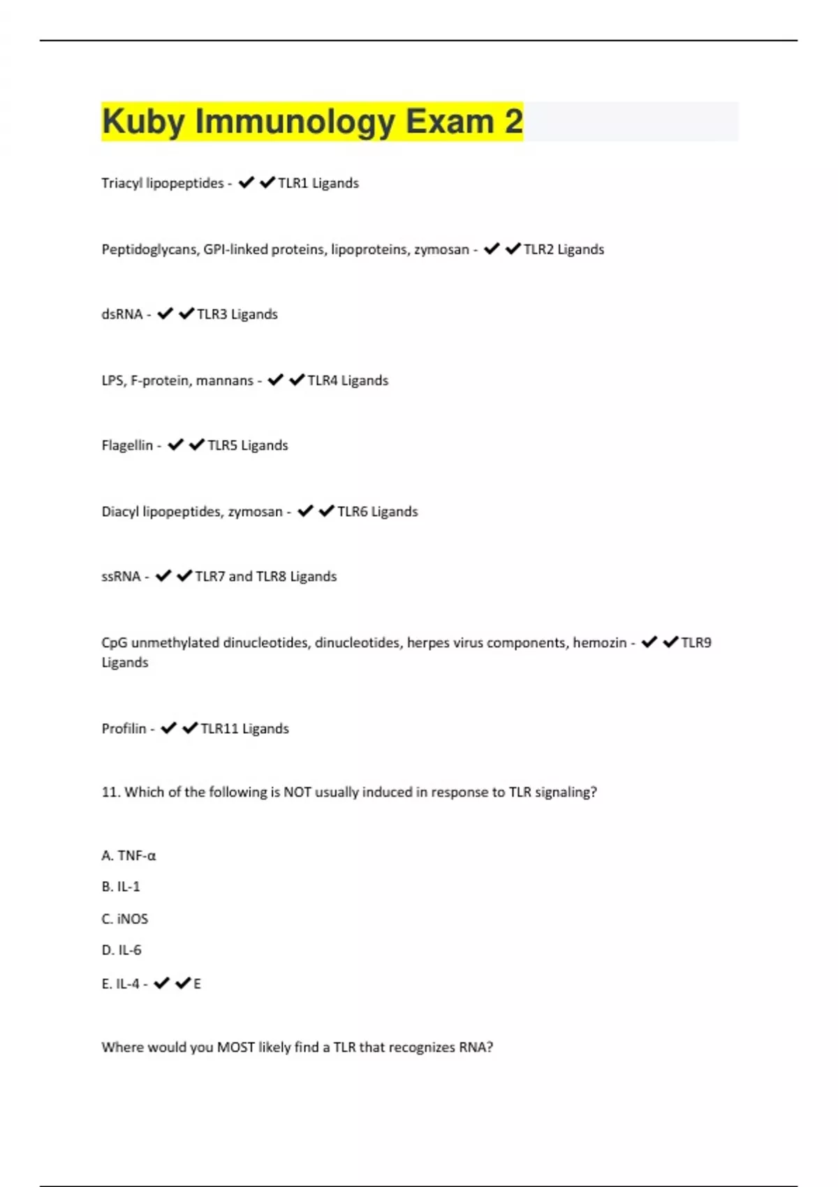 Triacyl lipopeptides - TLR1 Ligands Peptidoglycans, GPI-linked proteins, lipoproteins, zymosan - TLR2 Ligands dsRNA - TLR3 Ligands LPS, F-protein, mannans - TLR4 Ligands Flagellin - TLR5 Ligands Diacyl lipopeptides, zymosan - TLR6 Ligands ssRNA - TLR7 and TLR8 Ligands CpG unmethylated dinucleotides, dinucleotides, herpes virus components, hemozin - TLR9 Ligands Profilin - TLR11 Ligands 11. Which of the following is NOT usually induced in response to TLR signaling? A. TNF-α B. IL-1 C. iNOS D. IL-6 E. IL-4 - E Where would you MOST likely find a TLR that recognizes RNA?A. On the cell surface B. In the endosome/lysosome C. In the nucleus D. In the mitochondria E. In the endoplasmic reticulum - B