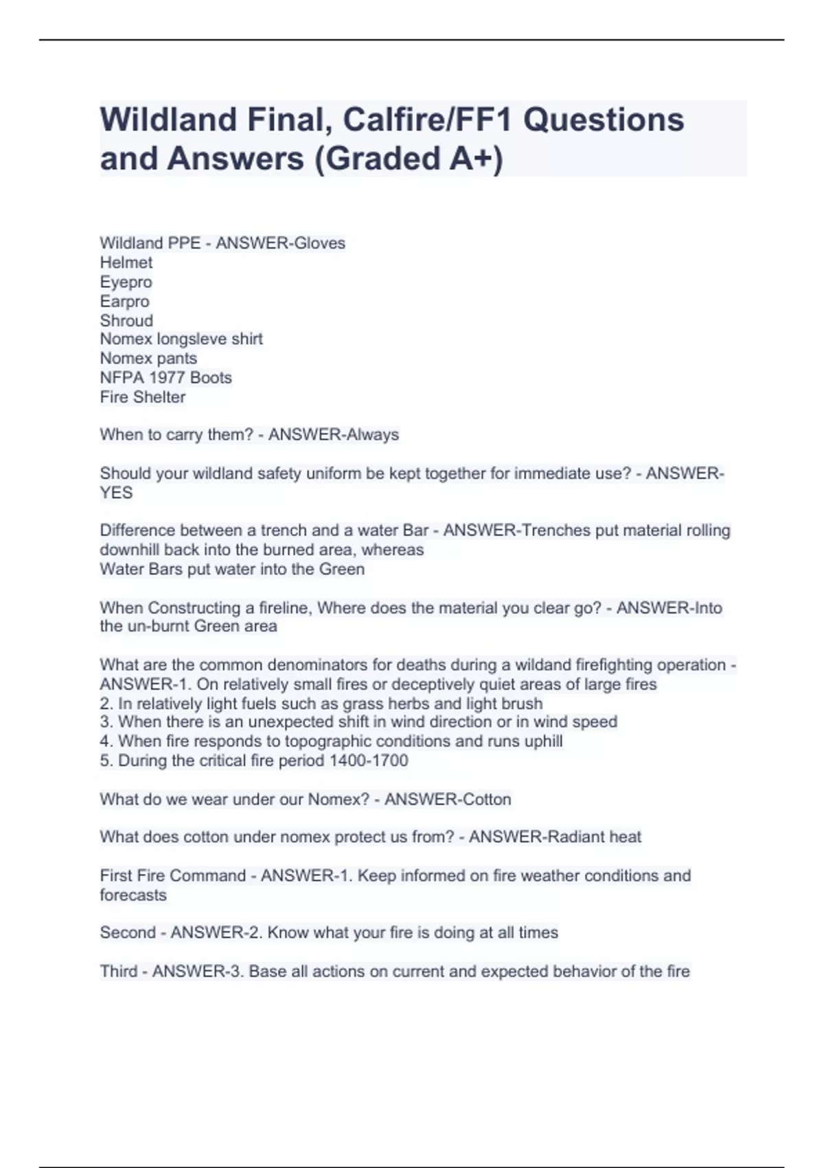 Wildland PPE - ANSWER-Gloves Helmet Eyepro Earpro Shroud Nomex longsleve shirt Nomex pants NFPA 1977 Boots Fire Shelter When to carry them? - ANSWER-Always Should your wildland safety uniform be kept together for immediate use? - ANSWER-YES Difference between a trench and a water Bar - ANSWER-Trenches put material rolling downhill back into the burned area, whereas Water Bars put water into the Green When Constructing a fireline, Where does the material you clear go? - ANSWER-Into the un-burnt Green area What are the common denominators for deaths during a wildand firefighting operation - ANSWER-1. On relatively small fires or deceptively quiet areas of large fires 2. In relatively light fuels such as grass herbs and light brush 3. When there is an unexpected shift in wind direction or in wind speed 4. When fire responds to topographic conditions and runs uphill 5. During the critical fire period What do we wear under our Nomex? - ANSWER-Cotton What does cotton under nomex protect us from? - ANSWER-Radiant heat First Fire Command - ANSWER-1. Keep informed on fire weather conditions and forecasts Second - ANSWER-2. Know what your fire is doing at all times Third - ANSWER-3. Base all actions on current and expected behavior of the fire 4th - ANSWER-4. Identify escape routes and safety zones, and make them known 5th - ANSWER-5. Post lookouts when there is possible danger 6th - ANSWER-6. Be alert, Keep calm, think clearly, act decisively 7th - ANSWER-7. Maintain prompt communication with your forces, your supervisor,